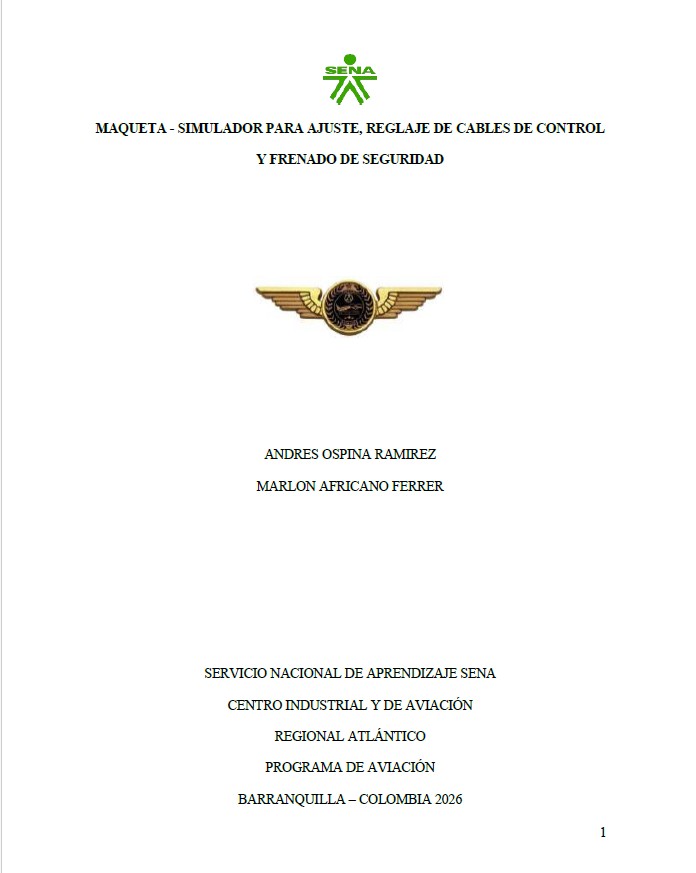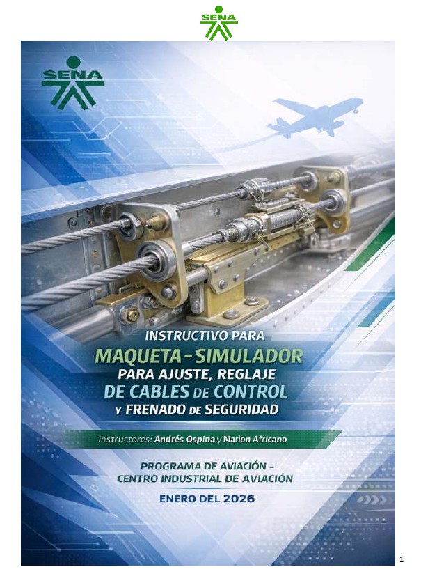 El documento corresponde a un instructivo técnico–didáctico que orienta al aprendiz en el montaje, ajuste, reglaje y frenado de seguridad de cables de control en sistemas aeronáuticos, utilizando una maqueta–simulador como herramienta de aprendizaje. Su propósito es fortalecer las competencias prácticas en mantenimiento de aeronaves, en concordancia con las normas aeronáuticas vigentes y los lineamientos del RAC 147 . A lo largo del contenido, se abordan los conceptos fundamentales de los cables de control, sus tipos, componentes y sistemas de tensión, así como los métodos de frenado de seguridad (safety wiring) aplicados a diferentes elementos aeronáuticos. Además, el instructivo incluye actividades prácticas paso a paso, criterios de evaluación y recomendaciones de seguridad que permiten al aprendiz aplicar los procedimientos de manera correcta, segura y estandarizada.