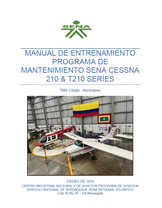 Este documento es un manual de entrenamiento técnico del SENA (Regional Atlántico) diseñado como guía didáctica para la formación de personal en el mantenimiento de aeronaves Cessna Series 210 y T210. Su propósito central es fortalecer las competencias técnicas de los aprendices mediante el estudio de procedimientos ...