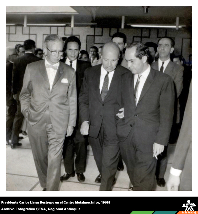 Se aprecia al entonces Presidente de Colombia Carlos Alberto Lleras Restrepo siendo recibido por el Maestro Rodolfo Pérez, director del Coro de voces masculinas del SENA, en su visita al Centro Metalmecánico.
