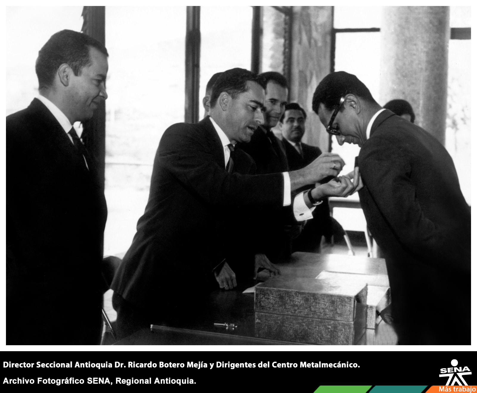 Director Seccional de Antioquia, Dr. Ricardo Botero Mejía condecora a uno de los dirigentes del Centro Metalmecánico.