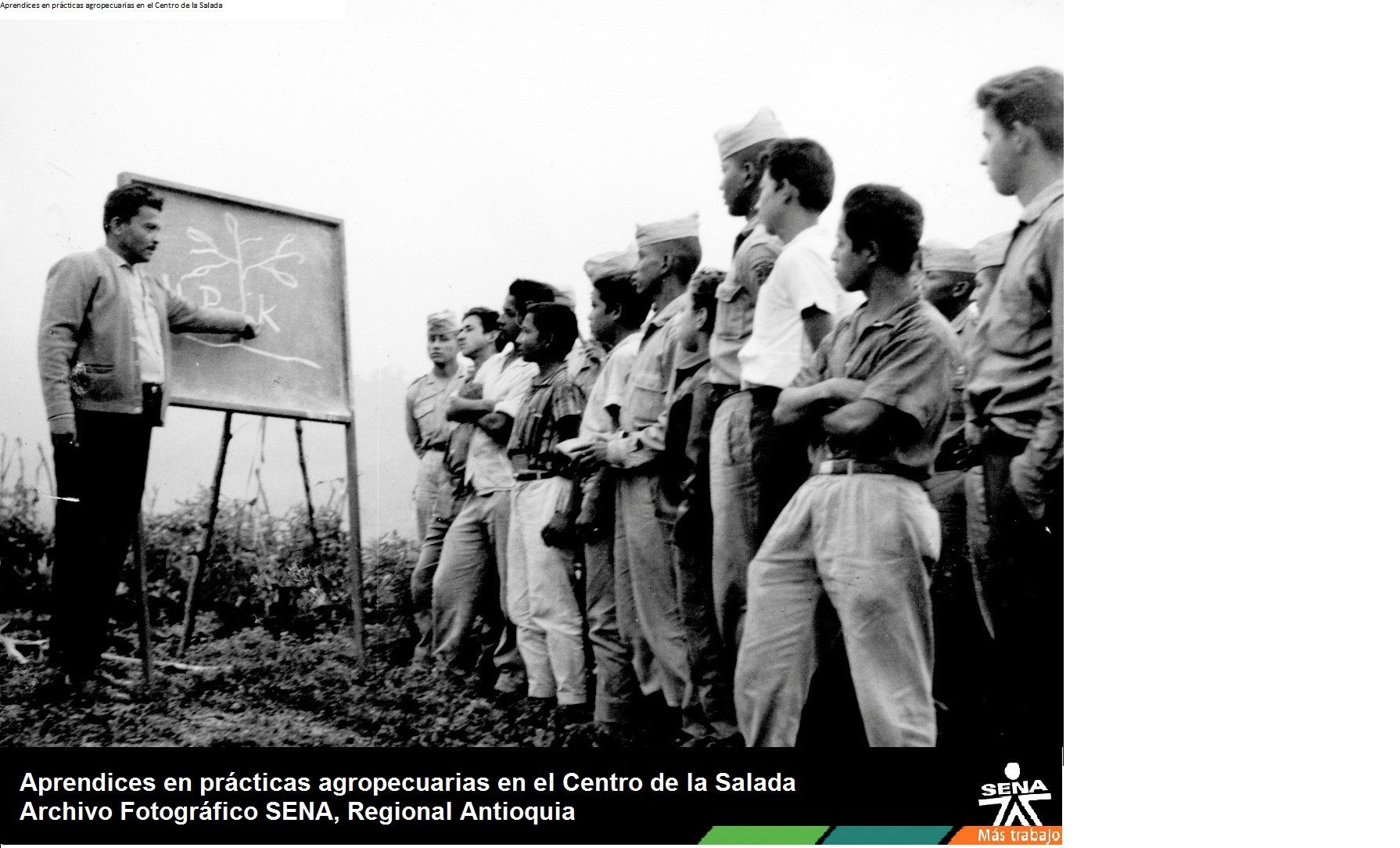 Instructor de los cursos que forman parte del programa agropecuario de La Salada con un grupo de aprendices, impartiendo clase en el campo.