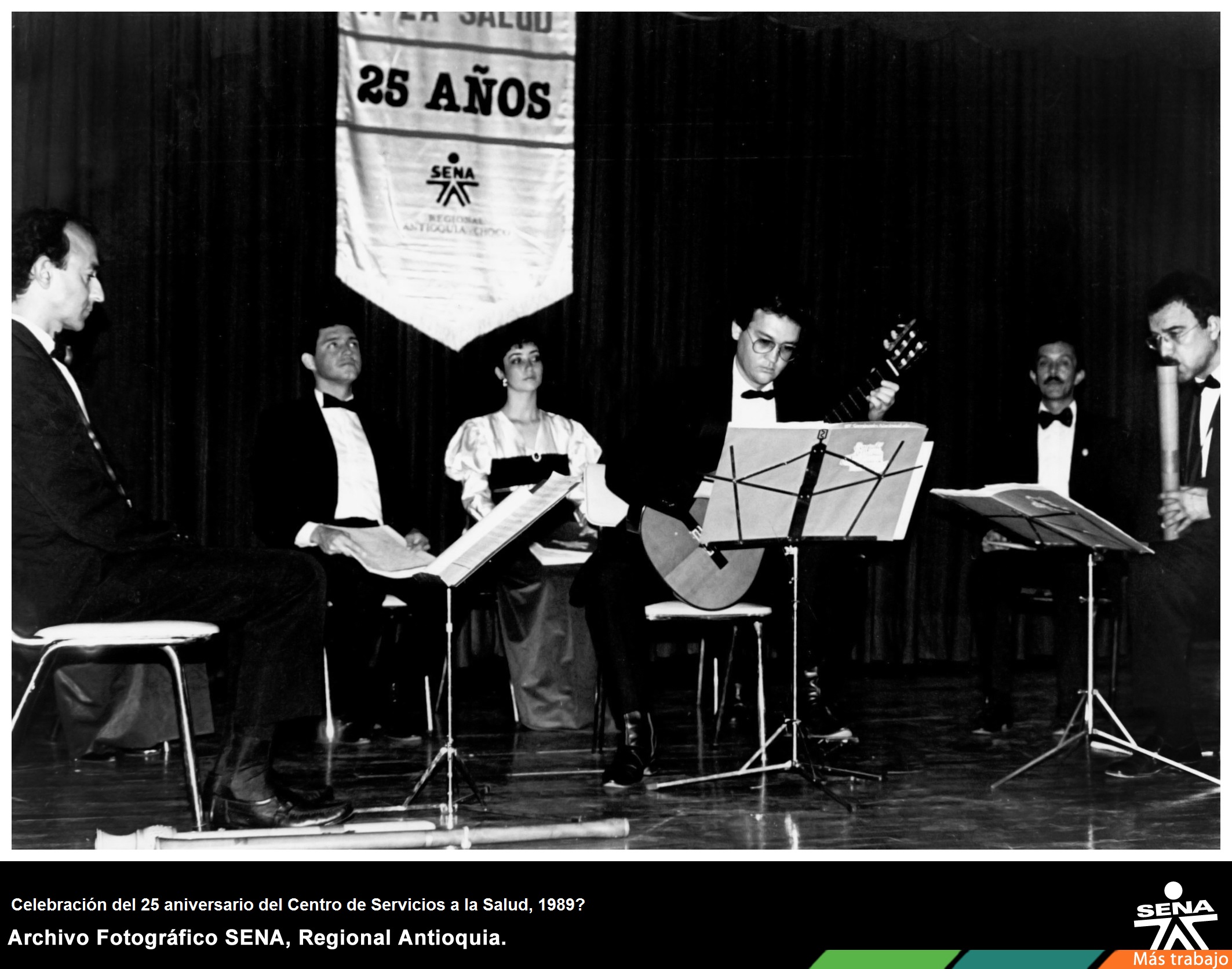 Grupo musical interpretando una melodía en el marco de la celebración de los veinticinco años de labores del Centro de Servicios a la Salud del SENA, Regional Antioquia