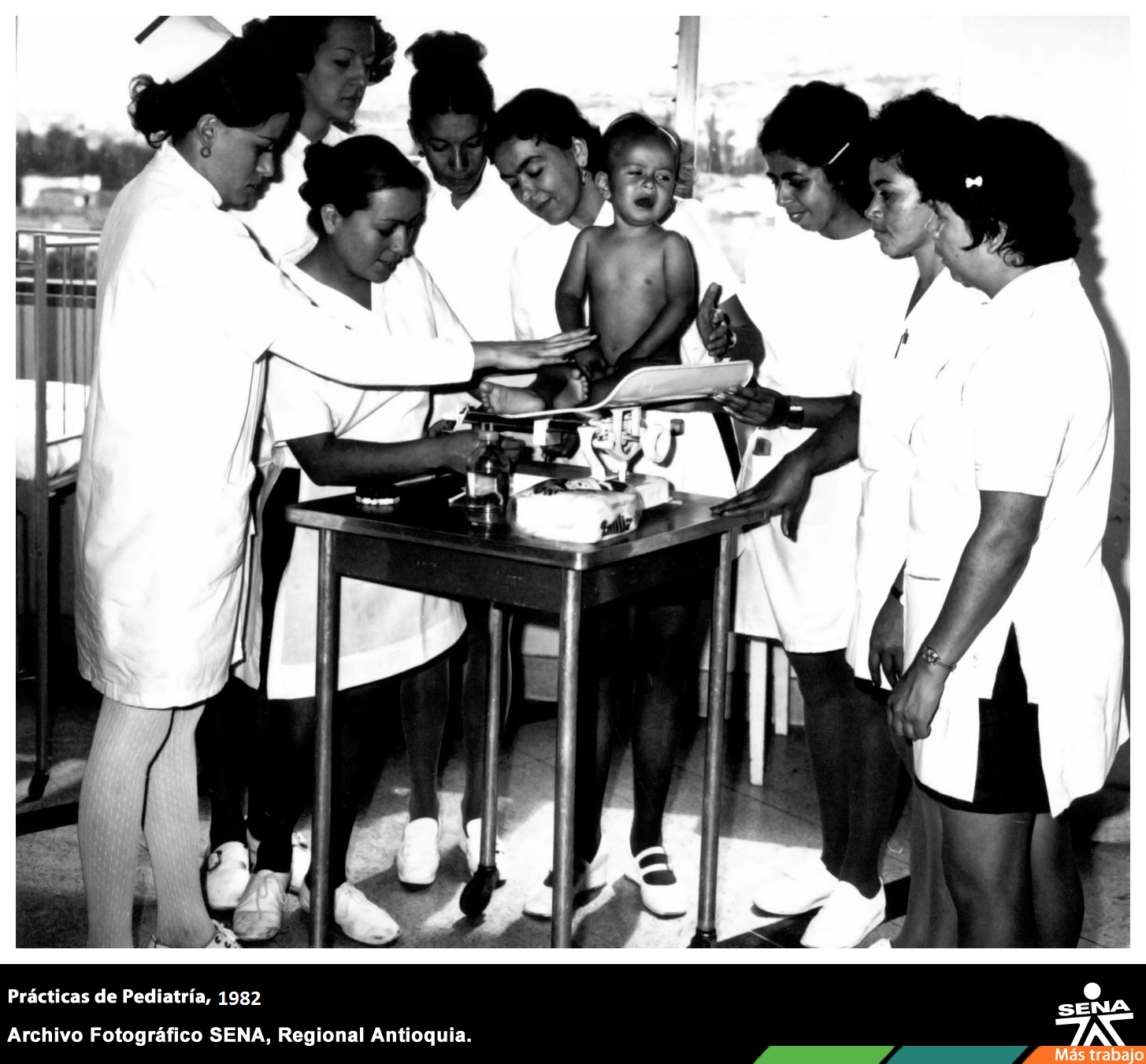 Instructora y aprendizas del Centro de Servicios de Salud, examinando un niño en el desarrollo de sus prácticas de enfermería en el Hospital San Vicente de Paúl de Medellín.