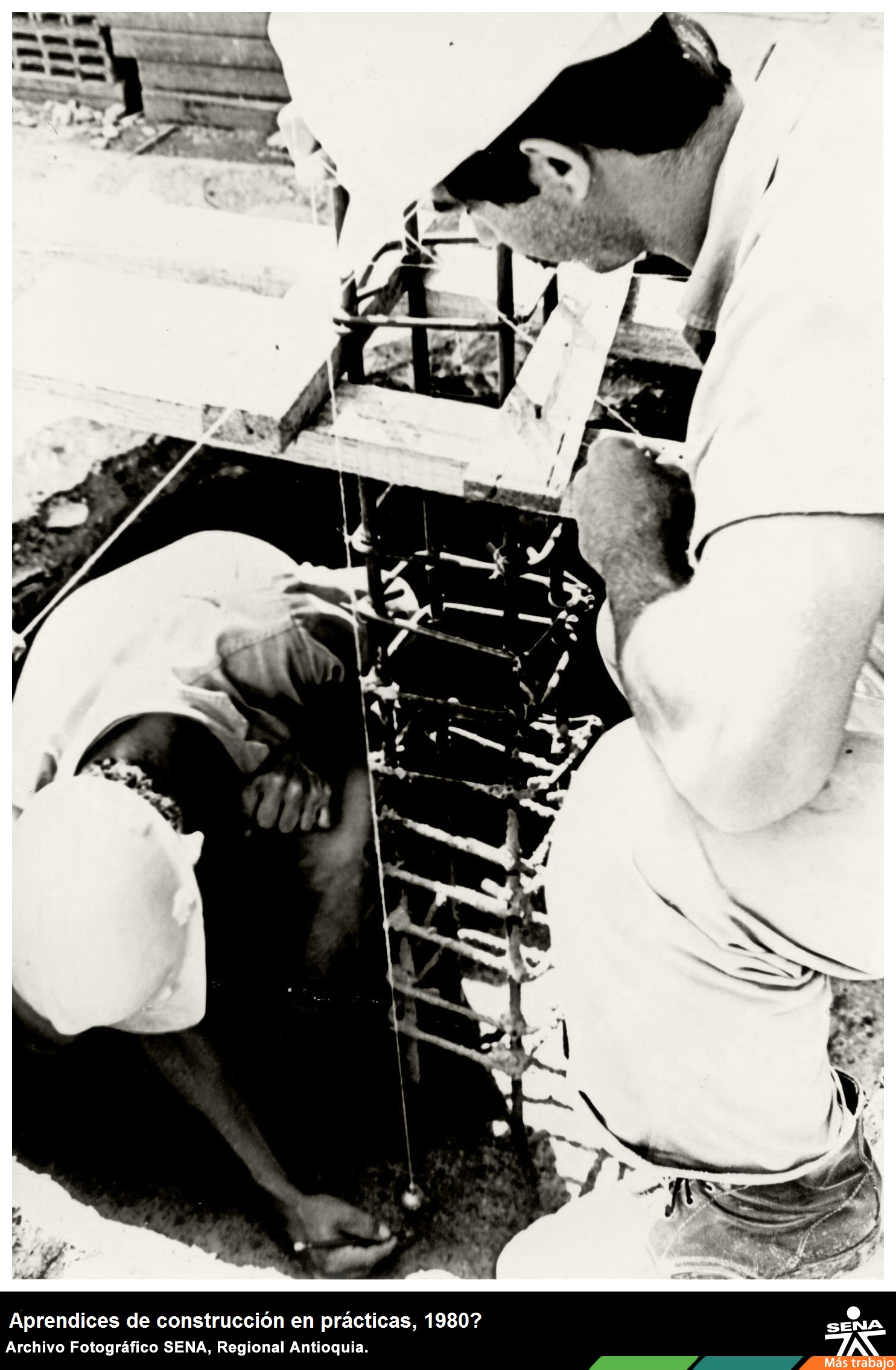 Dos aprendices en práctica del Centro de la Construcción armando una formaleta