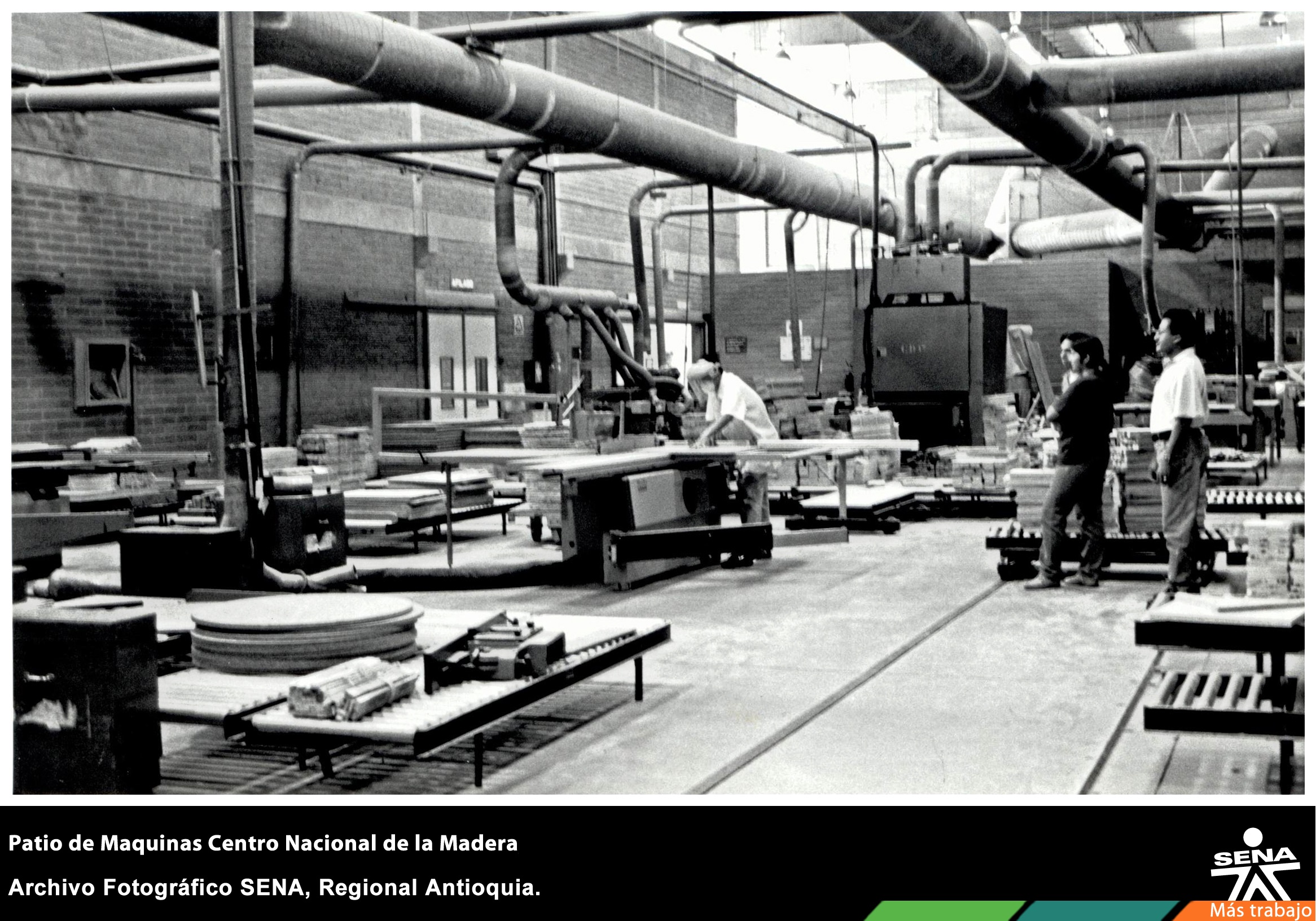 Aspecto Interior de los talleres y maquinaria del Centro Nacional de la Madera en el que visitantes observan el trabajo de un aprendiz.