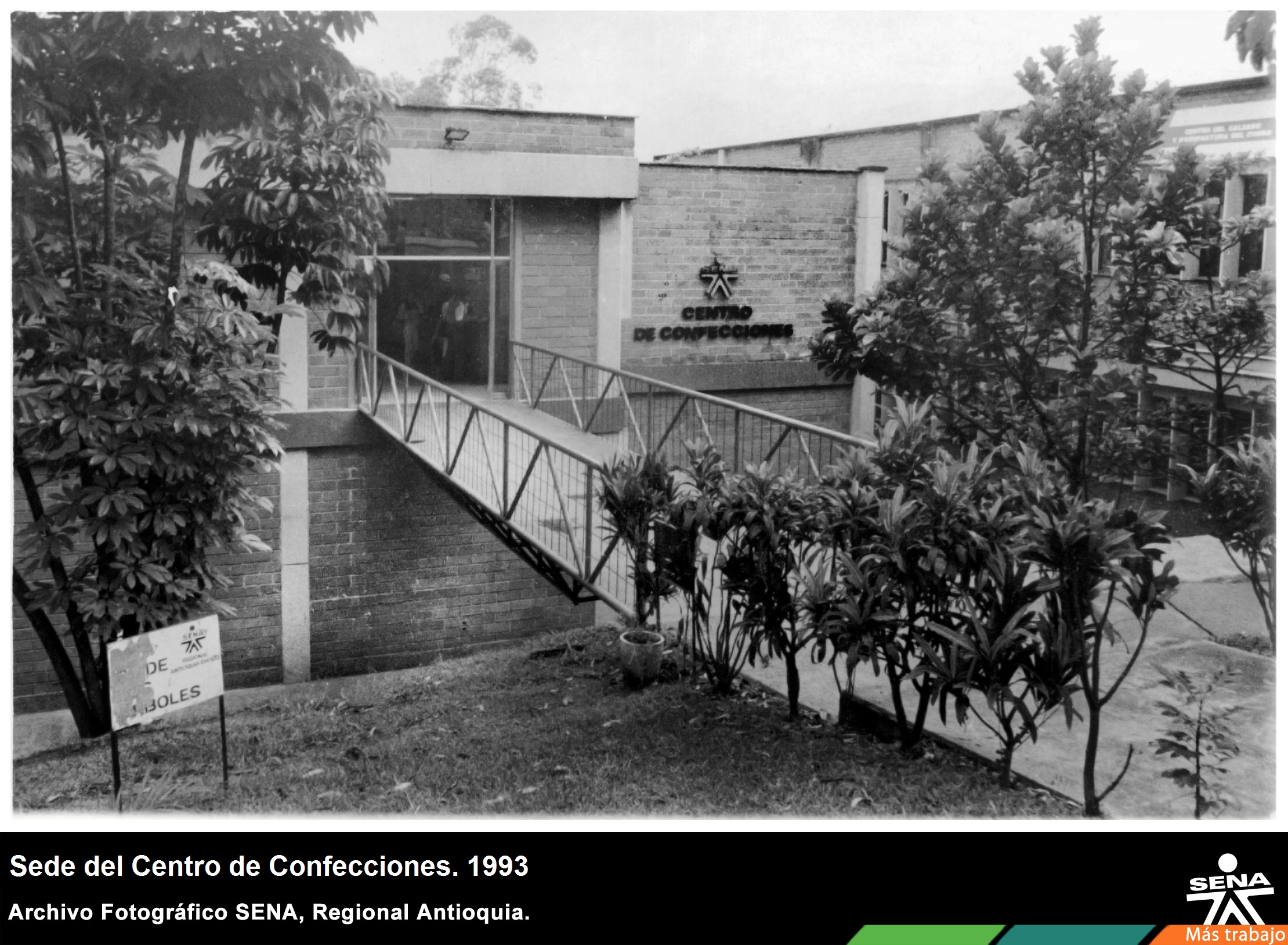 La formación en el campo de las confecciones inició en 1965 en el Centro industrial el Pedregal, ya en 1967 su funcionamiento paso a al Centro Nacional Textil, en abril de 1969 se inaugura en Medellín el Centro de Instrucción para la Confección mediante convenio entre la seccional y confecciones Colombia, pero el Centro de la Confección sólo se creó en 1978, a partir de ahí comenzó la formación profesional en ese campo. En 1988 El Centro fue traslado a las instalaciones del Centro Colombo Canadiense de la Madera en Itagüí y en 1989 iniciaron las operaciones del Centro de Confecciones del SENA en la nueva sede. En la fotografía se plasma la fachada del Centro de confecciones al año de 1993.