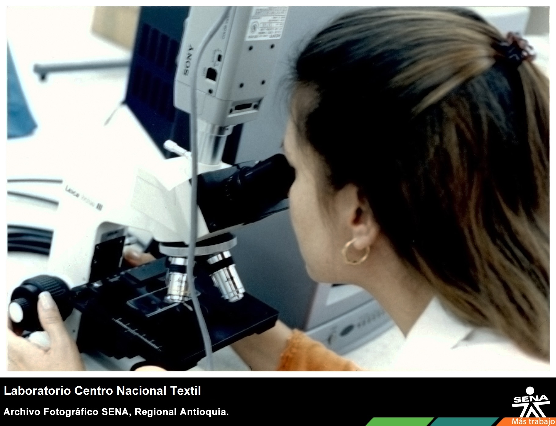 La Instructora Claudia Patricia Gómez Peláez, observa muestra a través del microscopio en el Laboratorio de Calidad del Centro Nacional Textil del SENA.