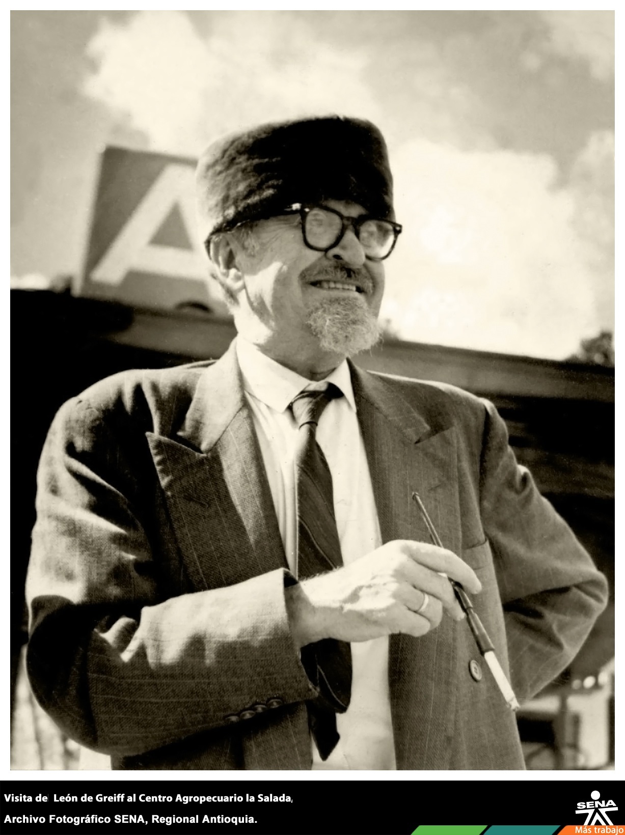 Poeta antioqueño León de Greiff sosteniendo su pipa, en visita al Centro de los Recursos Naturales Renovables, La Salada, en Caldas Antioquia.