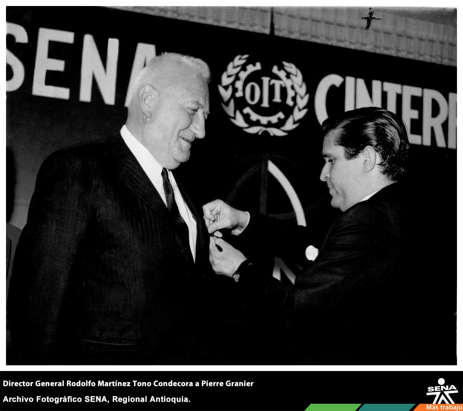 Rodolfo Martínez Tono condecora a Pierre Granier representante de la OIT y asesor del SENA, en el marco del I Seminario Cinterfor (Centro Interamericano para el desarrollo del conocimiento en la Formación profesional) de la OIT (Organización Internacional del Trabajo y el SENA. Pierre Granier, fue uno de los primeros asesores tecnológicos del SENA. Aportó a la construcción del Complejo Norte en Medellín y sucesivos complejos y centros de formación en el país.