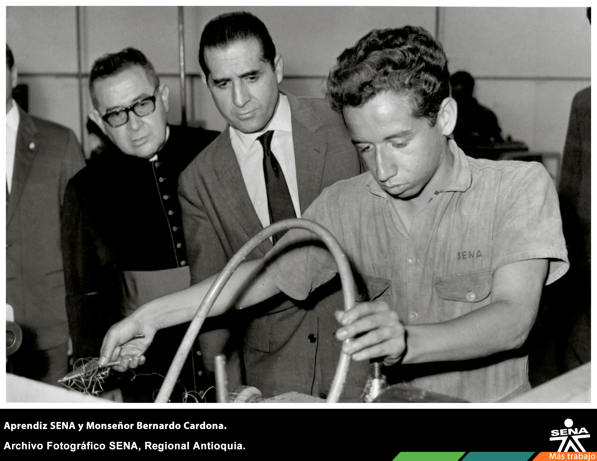 Aprendiz del Centro Nacional Textil del SENA es observado por Monseñor Bernardo Cardona Pérez y un delegado del Vicepresidente de Desarrollo de Inglaterra señor Edgar Vauhan en visita al Centro.