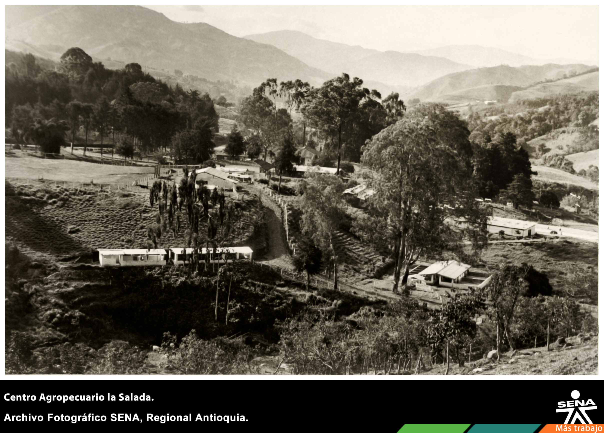 Panorámica de la fachada del Centro Agropecuario La Salada, en el Municipio de Caldas, Antioquia. El Centro inicia cursos de formación en temas agropecuarios el 19 de febrero de 1962, el radio de acción de este centro se extendió rápidamente a otros municipios como Urrao, Venecia, Santafé de Antioquia y la Región de Urabá
