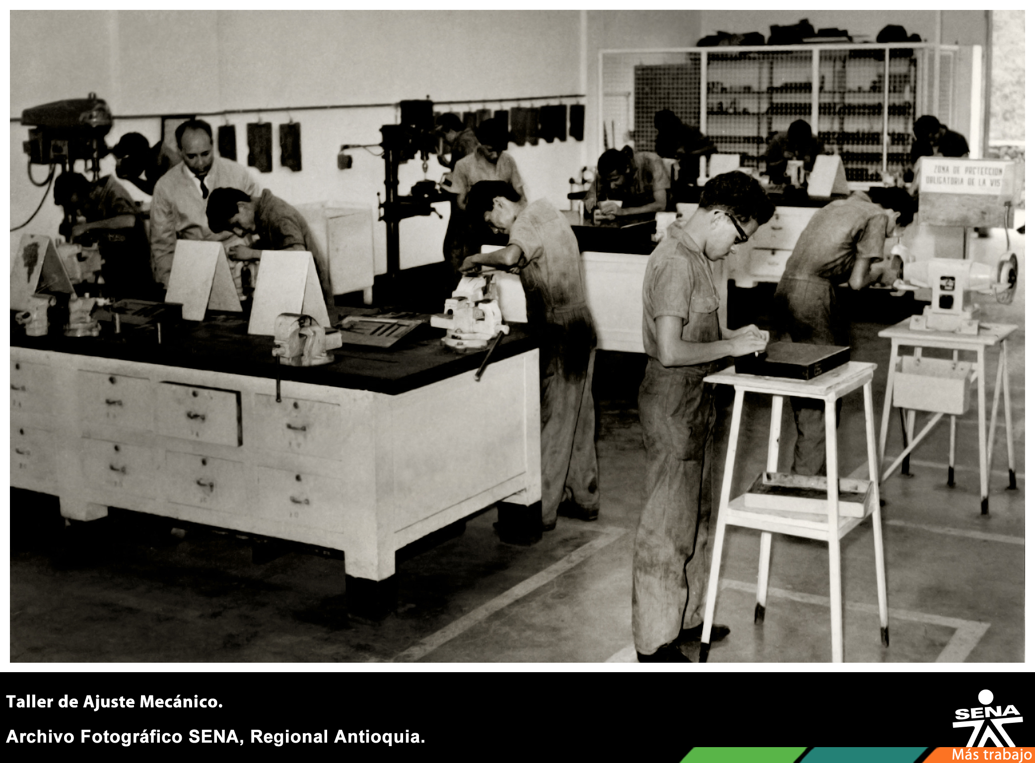 Instructor da indicaciones a los aprendices en el Taller de Ajuste Mecánico, del Centro Metalmecánico, ubicado en el Complejo Norte, Barrio Pedregal.