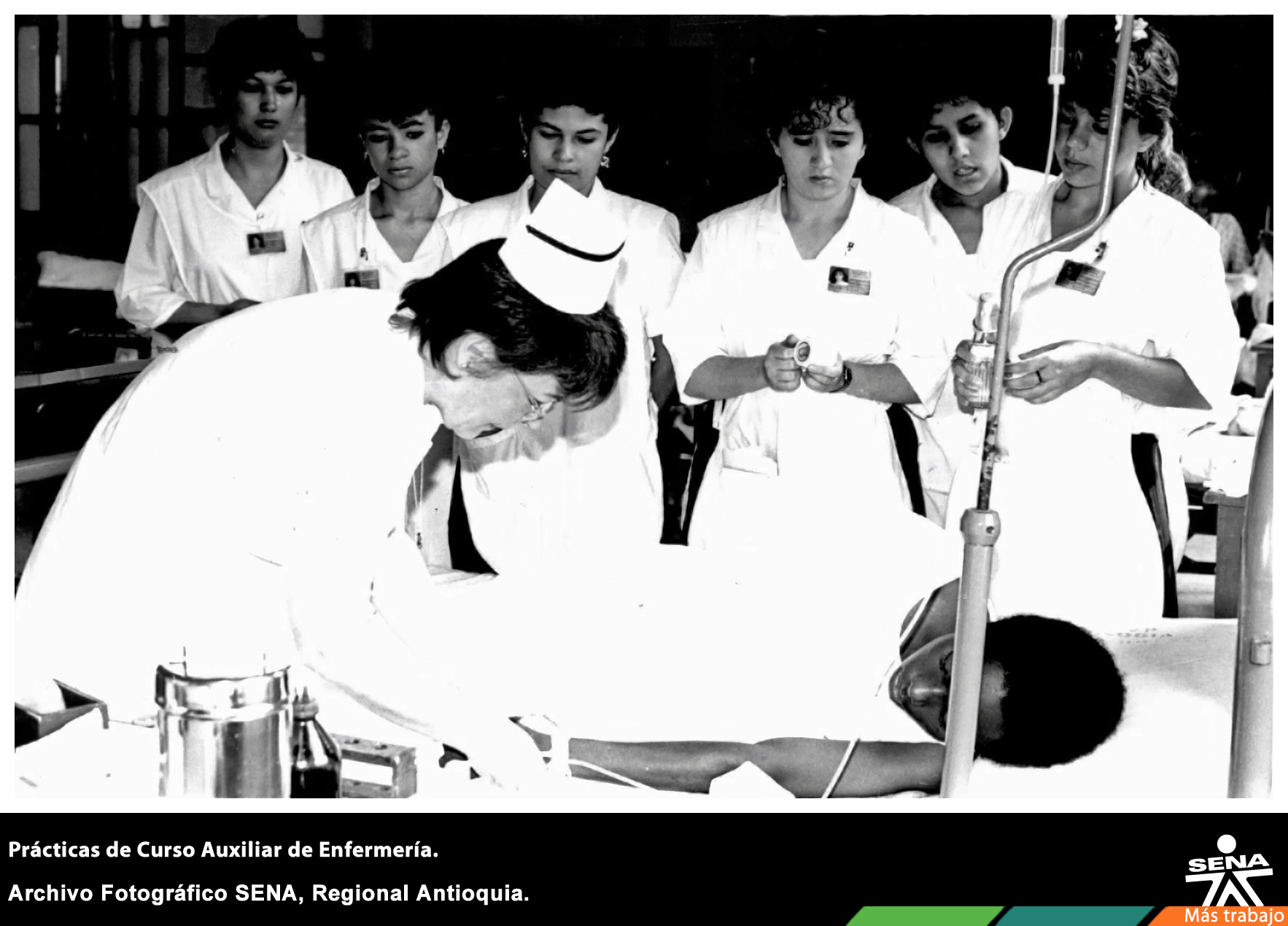 Instructora y aprendizas del Centro de Servicios de Salud, regional Antioquia examinando un paciente en el desarrollo de sus prácticas de enfermería en el Hospital San Vicente de Paul en Medellín