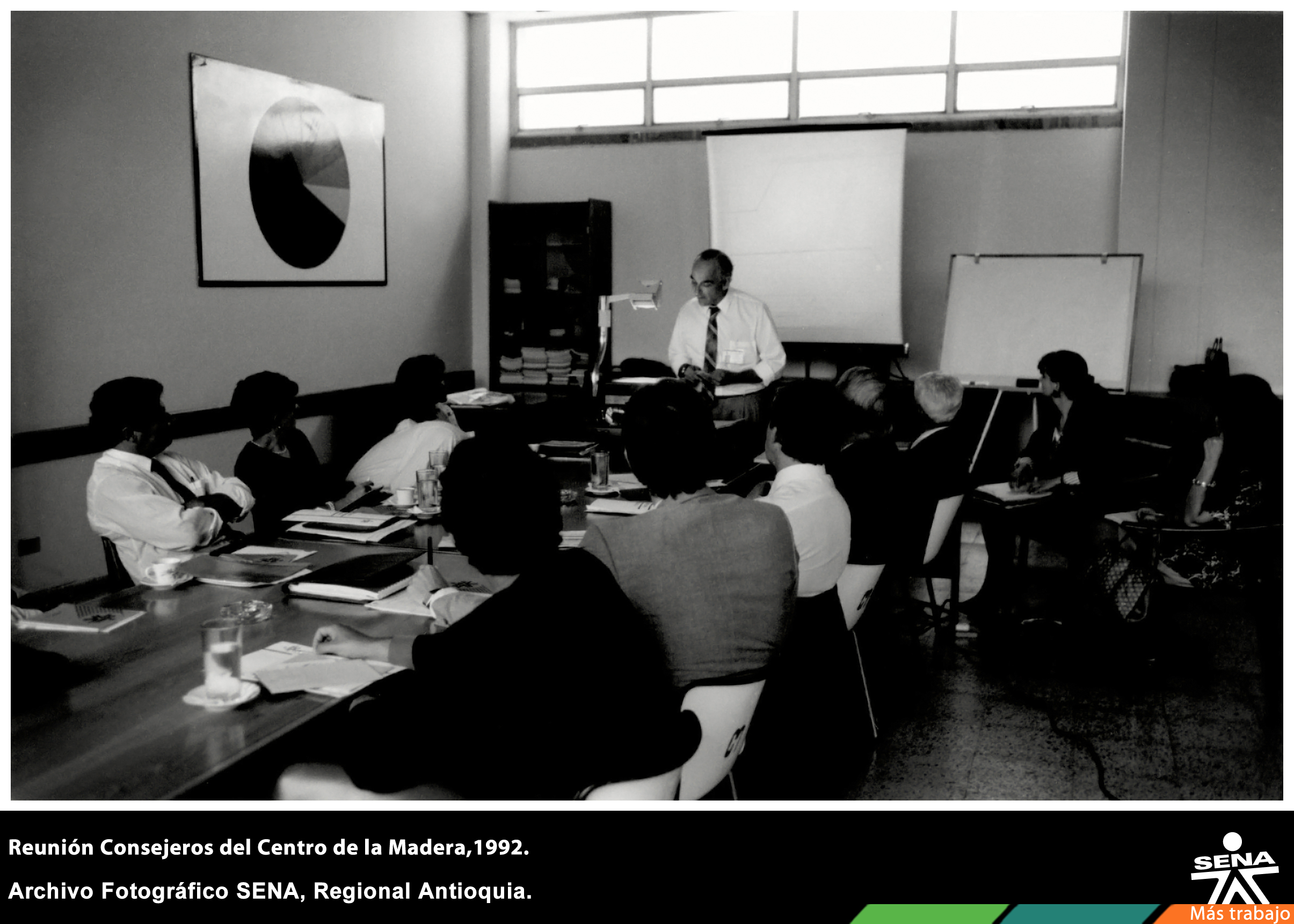 Asistentes a la reunión consejeros del Centro Nacional de la Madera de la regional Antioquia del SENA en 1992.