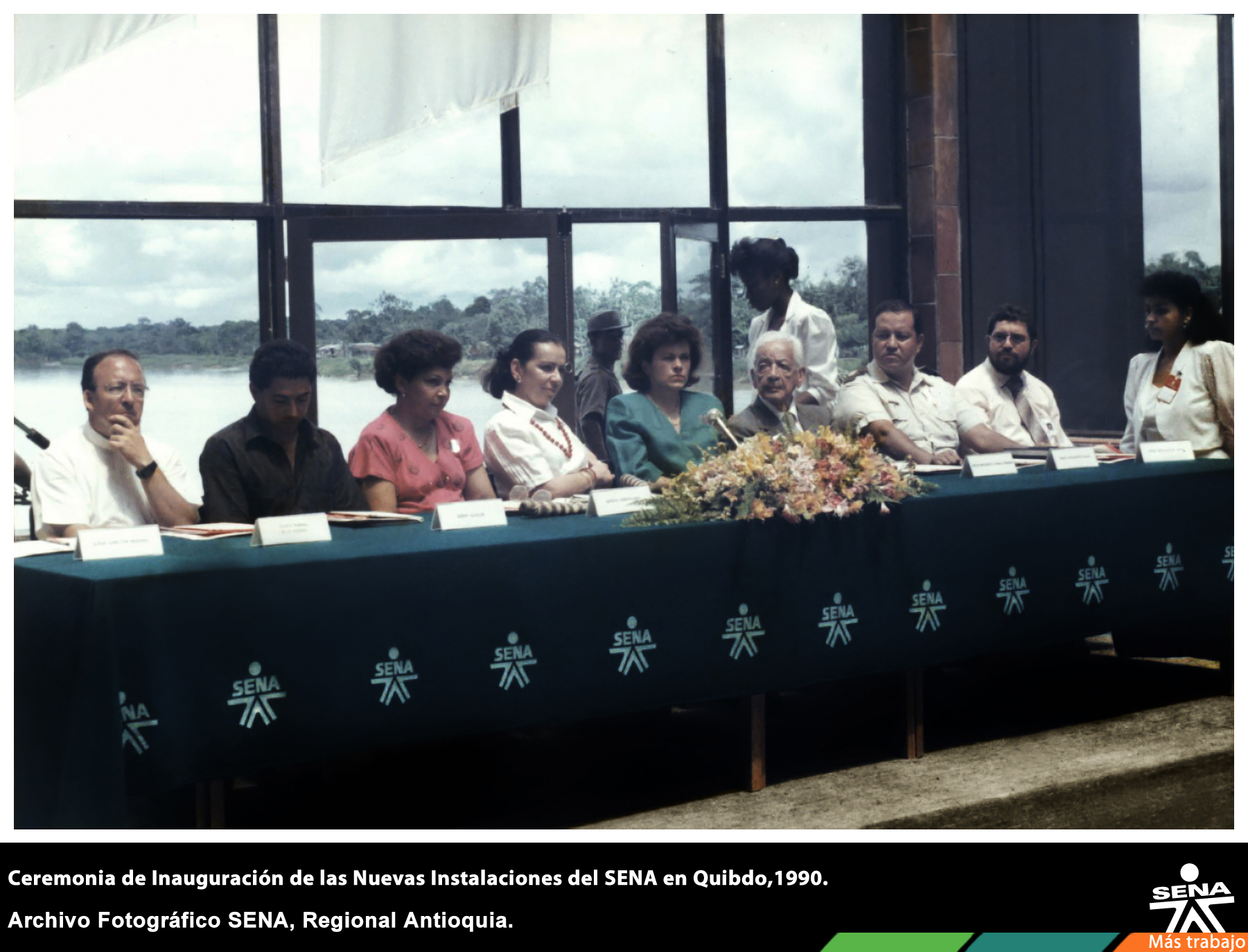 Asistentes a la Inauguración del Centro Múltiple de Quibdó, que se llevó a cabo en junio de 1990, el evento contó con la asistencia de la Directora Nacional del SENA Clara Villalba de Sandoval, el Director Regional del SENA Antioquia, Dr. Jorge Ivan Perez Pelaez, acompaña la ceremonia Jorge Gutiérrez Escobar, presidente Vitalicio del Consejo Regional del SENA y otros miembros del Consejo.