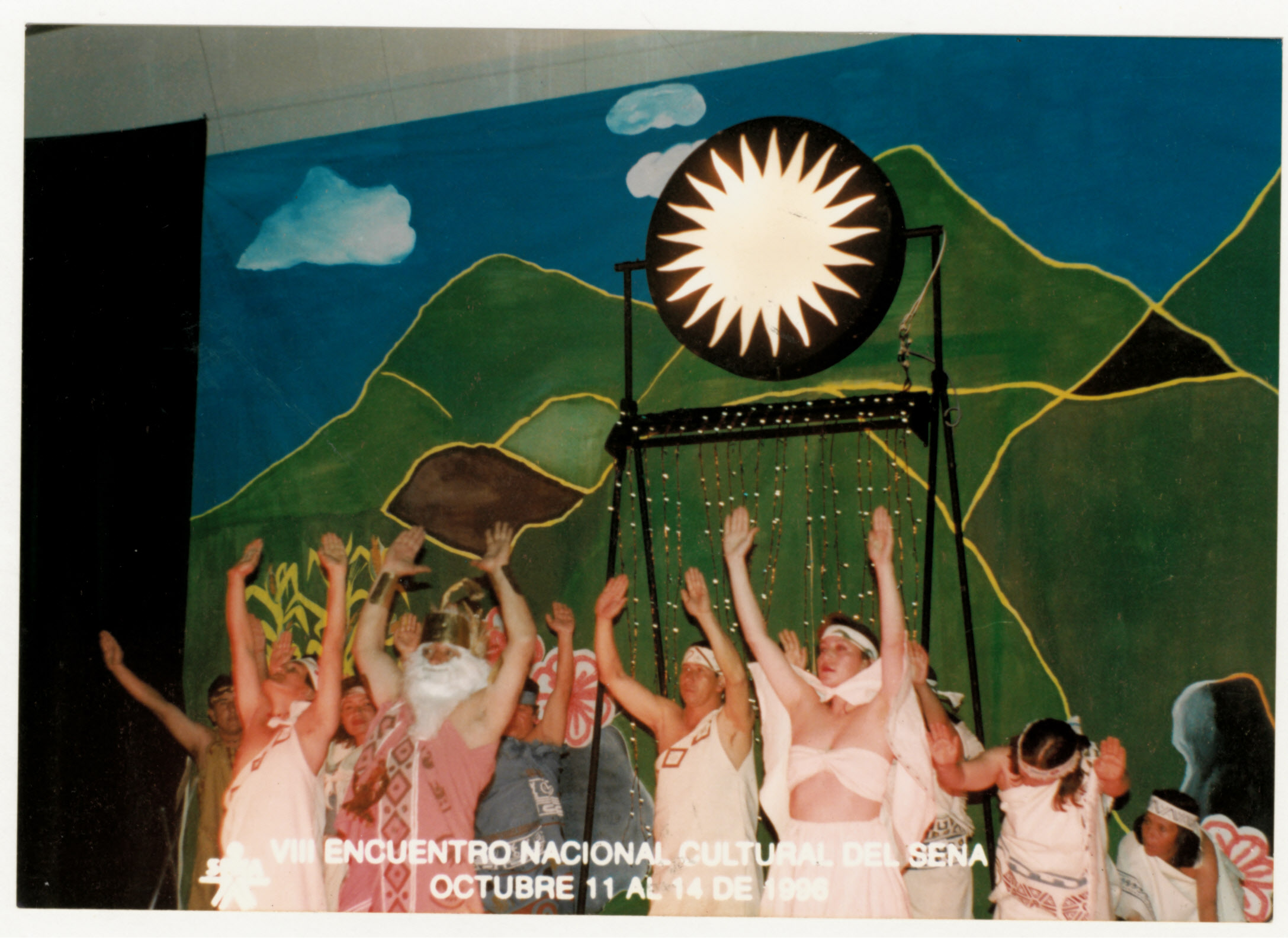 Funcionarios de la Regional Antioquia integrantes de grupo de teatro interpretando la obra "La tierra del sol" durante el Octavo Encuentro Nacional Cultural del SENA, realizado en Boyacá del 11 al 14 de octubre de 1996.