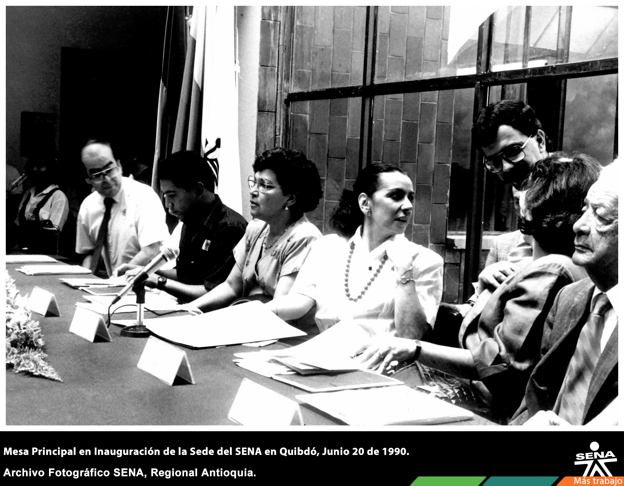 Asistentes a la Inauguración del Centro Múltiple de Quibdó, entregada en junio 20 de 1990. La Mesa Principal contó con la asistencia de la Directora Nacional del SENA Clara Villalba de Sandoval, el Director Regional del SENA Antioquia, Dr. Jorge Ivan Perez Pelaez, acompaña la ceremonia Jorge Gutiérrez Escobar, presidente Vitalicio del Consejo Regional del SENA, y otros miembros del Consejo.