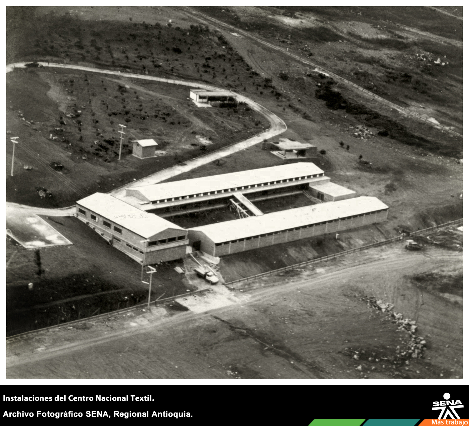 Panorámica en la que se aprecia la fachada de las instalaciones del Centro Nacional Textil de la regional Antioquia.