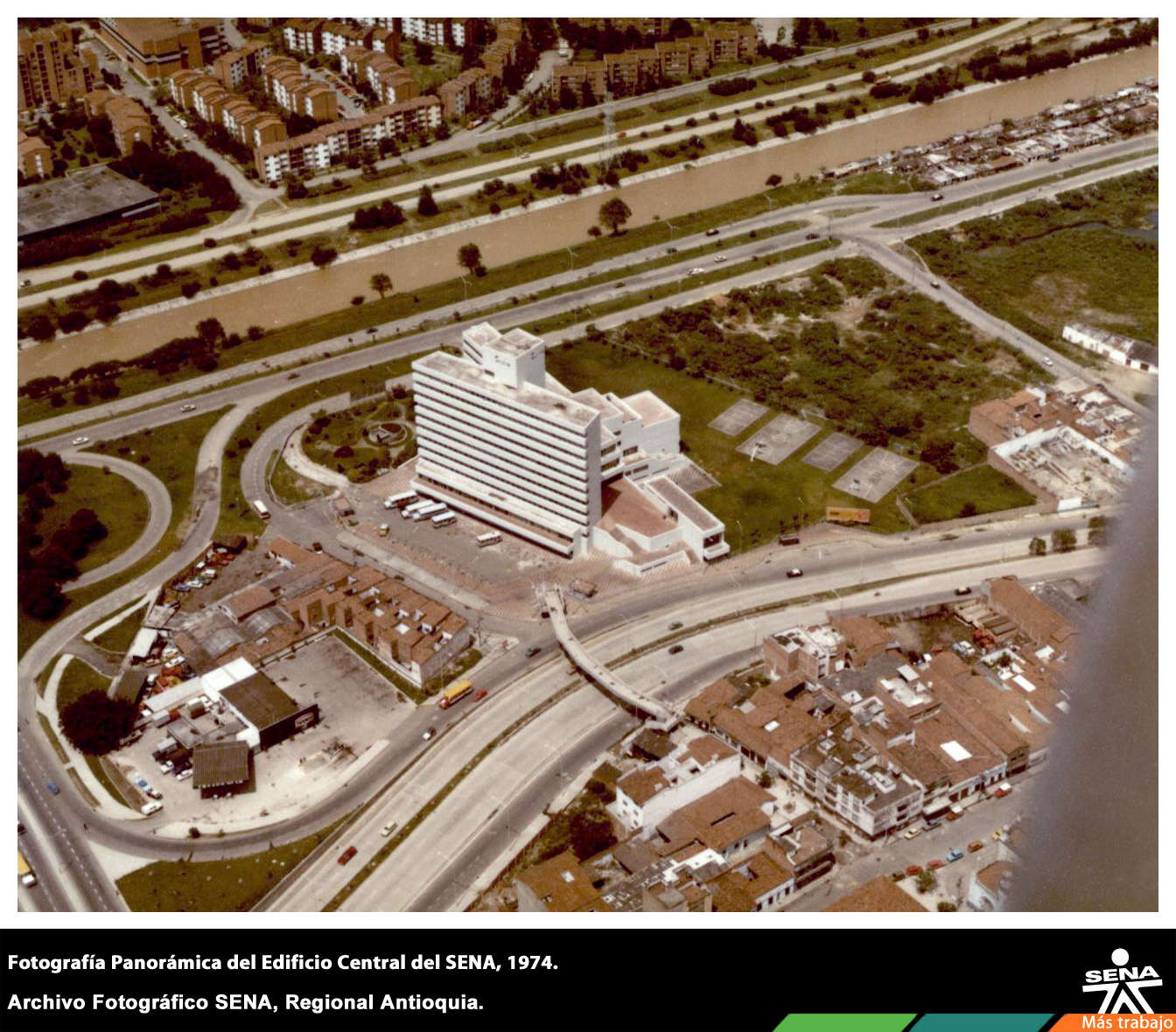 Vista panorámica del edificio Complejo Central del SENA e inmediaciones del Barrio San Benito en la ciudad de Medellín. Su construcción fue realizada por la firma "Constructora El Progreso" de Medellín con un área de 19.000 mts2, inaugurado el 6 de agosto de 1973 por el entonces Presidente de la República, Doctor Misael Pastrana Borrero.