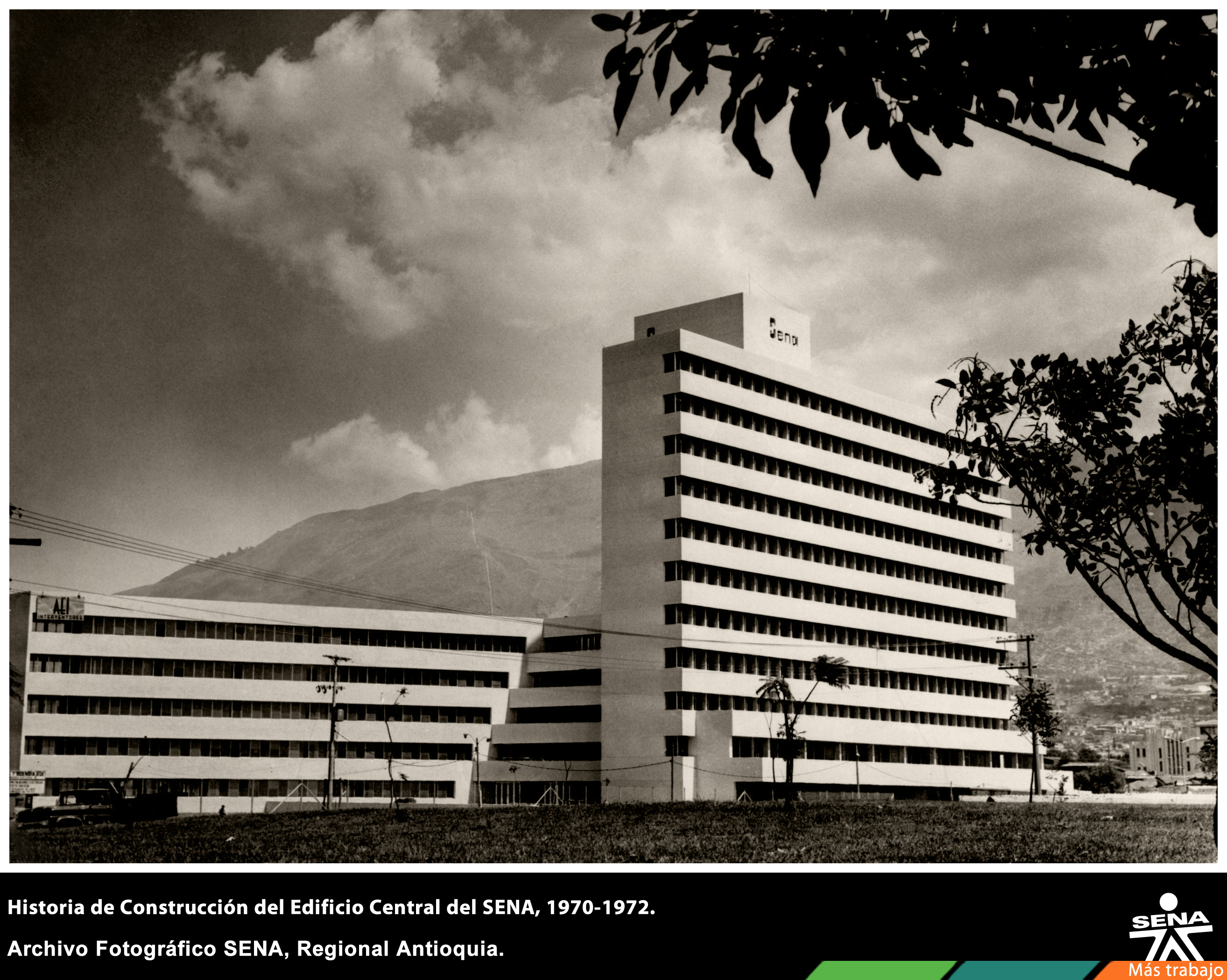 Panorámica del edificio Complejo Central del SENA. Construido por la firma "Constructora El Progreso" de Medellín con un área de 19.000 mts2, inaugurado el 6 de agosto de 1973 por el Presidente de la República, Doctor Misael Pastrana Borrero.