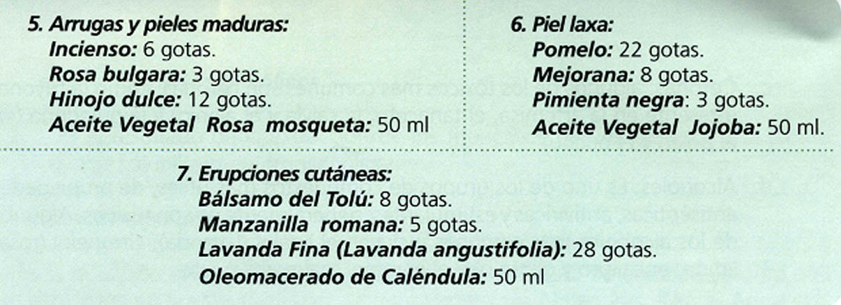 Usos: • Piel: Acné, dermatitis e infecciones menores de la piel, cicatrices, llagas, arrugas; válido para todo tipo de tratamientos cutáneos, tanto faciales, como de las manos, pies, cuello y labios (hidrata la piel, estimula la regeneración celular y regula la producción sebácea). • Aparato digestivo: Anorexia, atonía digestiva, infecciones intestinales. • Sistema nervioso: Agotamiento nervioso, enfermedades por estrés. Combina bien con: Ylang-Ylang, naranja, manzanilla romana, geranio, sándalo, cedro, pachulí, jazmín, neroli y otros florales. Toxicidad: No tóxico, no irritante, no sensibiliza.