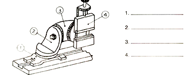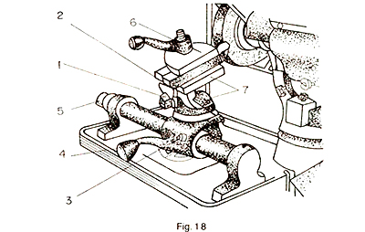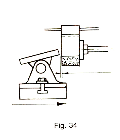 • Posiciónela y fíjela firmemente a la mesa de la máquina. • Inclínela con el ángulo indicado. Observación Para inclinar la mesa considere el ángulo de incidencia frontal de la herramienta. c. Prepare la máquina para rectificar - Desplace la muela verticalmente. Observación Deberá coincidir aproximadamente el centro de la muela con la mitad de la altura de la cara a rectificar. • Desplace la mesa longitudinalmente hasta que la mesa inclinable quede frente a la muela (Fig. 33) Y fije la mesa en los topes. • Desplace transversalmente la muela hasta la mesa inclinable aproximadamente 2 mm. (Fig. 34). • Ponga la máquina en funcionamiento. d. Afile la punta en radio. • Apoye la herramienta en la mesa inclinable. • Haga contacto suave entre la punta de la herramienta y la cara de la muela. Precaución Asegure la herramienta con firmeza Observación Verifique si el contacto es hecho del lado de la muela que el sentido de rotación es hacia abajo.