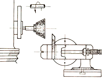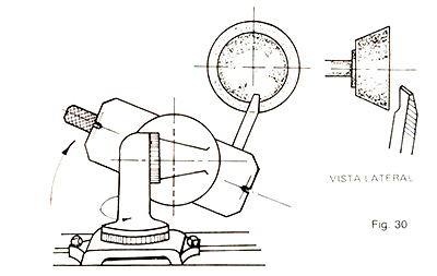 6. Rectificar la cara de ataque. a. Rectificar hasta limpiar la cara. Observación Haga un pequeño radio en la arista externa de la muela, para evitar el canto vivo en la rectificación de la cara. b. Rectifique hasta obtener la arista cortante. c. Pare la máquina y retire la herramienta. 7. Afilar manualmente punta con radio. El redondear la punta de las herramientas tiene por finalidad aumentar la resistencia de esta y mejorar el aspecto de la superficie trabajada. Tiene la forma de una superficie cónica, con inclinación de la superficie ligada a dos planos: cara frontal y cara lateral o las dos caras laterales. Esta operación es realizada manualmente con la herramienta apoyada sobre una pequeña mesa inclinable (Fig. 32), es aplicada en herramientas para desbastar, refrenar y repasar. a. Monte y rectifique la muela tipo copa, recta. Precaución Coloque la protección; en caso de rotura de la muela, esta retiene los fragmentos proyectados, evitando lesionarlo. Observación La rectificación de la muela debe ser hecha sin inclinar el cabezal porta muela, para que la cara frontal de la muela quede plana y paralela a la mesa. b. Monte la mesa inclinable.