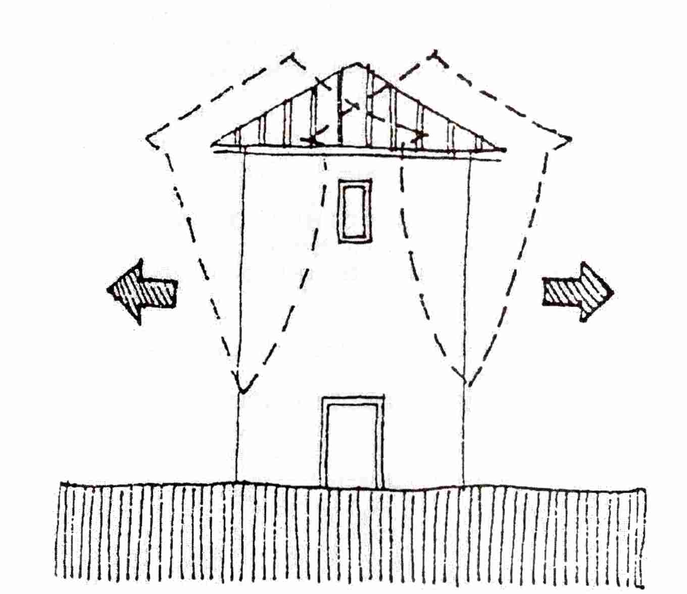 Por fractura o desmoronamiento del mismo, se forma un enhuacalado a base de arrastres verticales y horizontales que pisen unos a otros y empaquen perfectamente; se ligan los de una cara con los de la contraria con tornillos que sujeten sin causar penetración del arrastre sobre el elemento; después se ligan entre sí los de paramentos ortogonales y en "caso de recalce, apeo, se colocan bajo el desplante y sobre la corona "puentes", ligándose los inferiores y superiores de modo que sean los que reciban el esfuerzo transmitido por gatos, grúas o similares al hacer el movimiento.