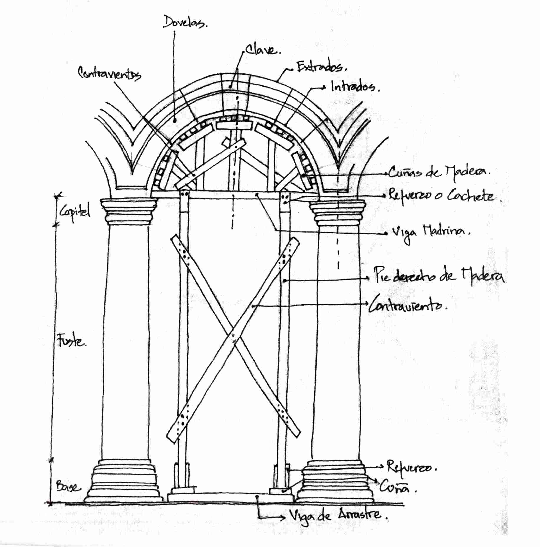 Siguiendo la generatriz del arco o de la bóveda, se colocan arrastres segmentados, empacando con pedazos de madera los huecos entre el arrastre y el intradós; estos arrastres a su vez son recibidos por tornapuntas dispuestos de modo que no provoquen empujes, los que a su vez descansan en un arrastre horizontal, el cual es recibido por pies derechos debidamente contraventeados que transmiten al piso las concentraciones a través de un arrastre horizontal.