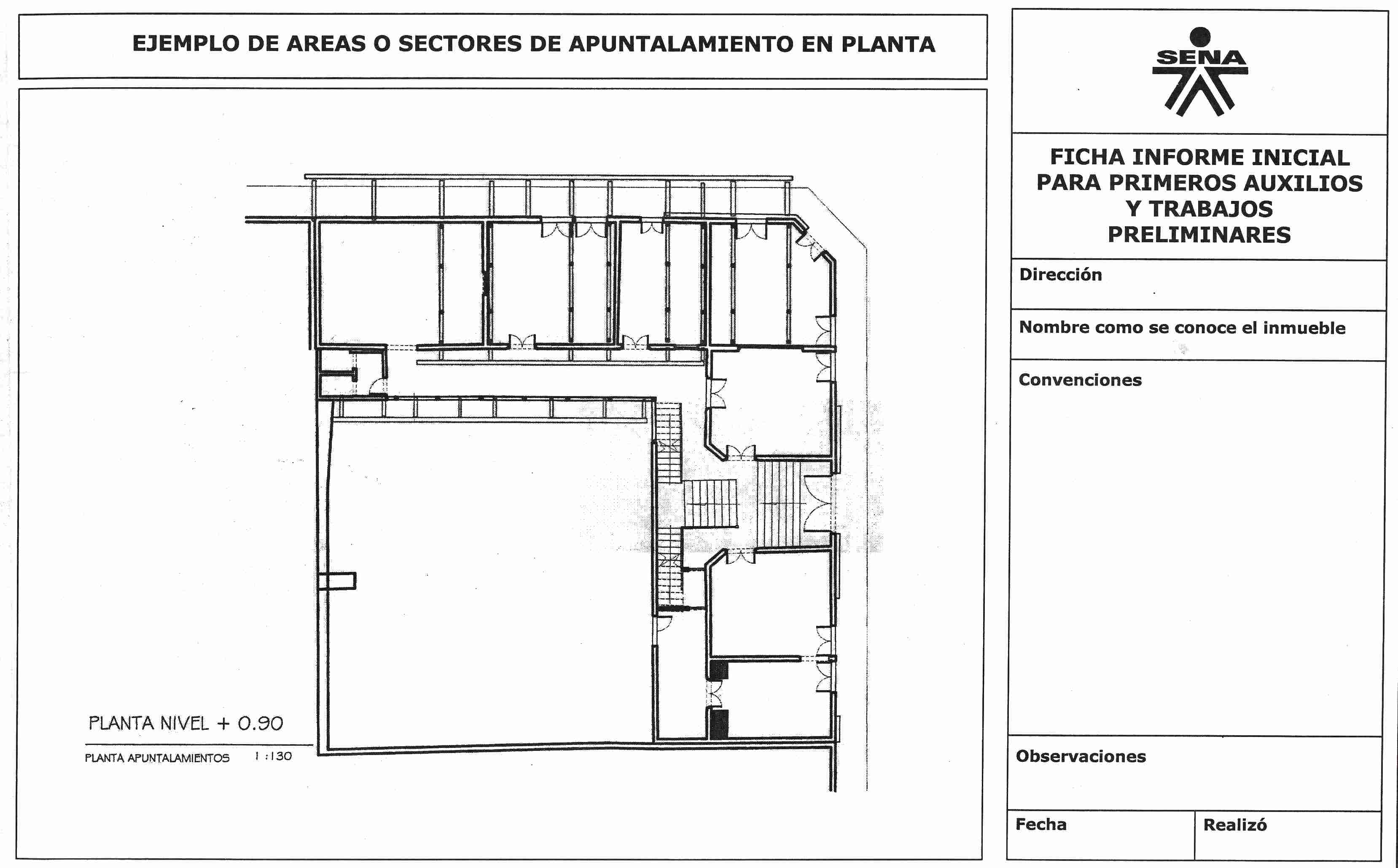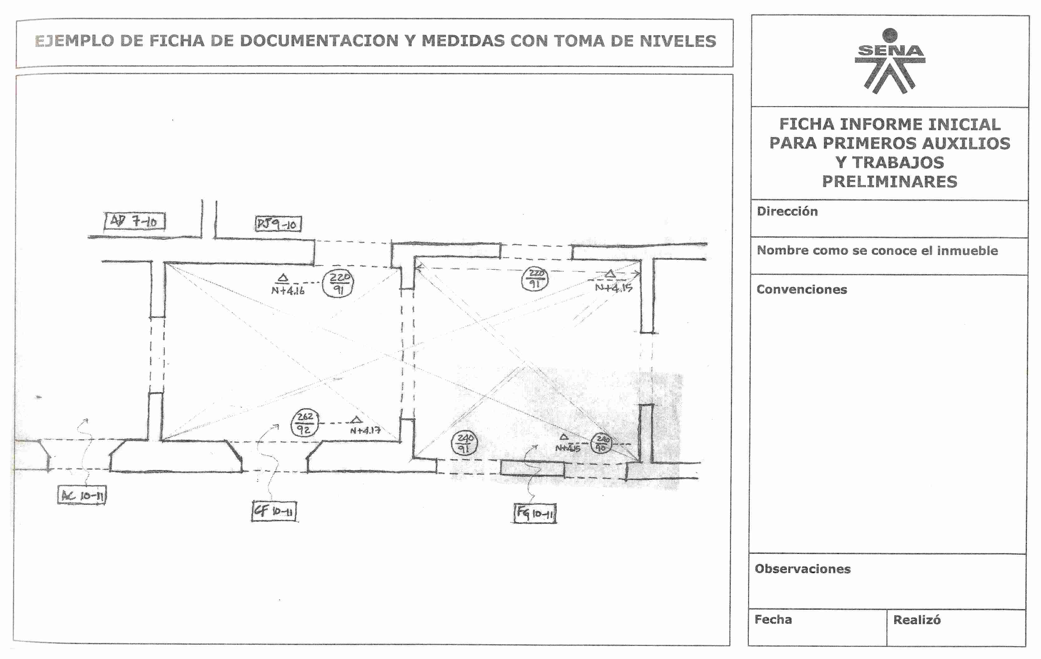 Recorrido general del inmueble. Realización en un plano base de todo el inmueble, para la instalación de la posible estructura general del apuntalamiento, donde se pueda constatar y localizar los puntos a apuntalar y el método a emplear. Una inadecuada instalación de uno o varios de los elementos del apuntalamiento, impediría la posterior medida de diagonales u horizontales.