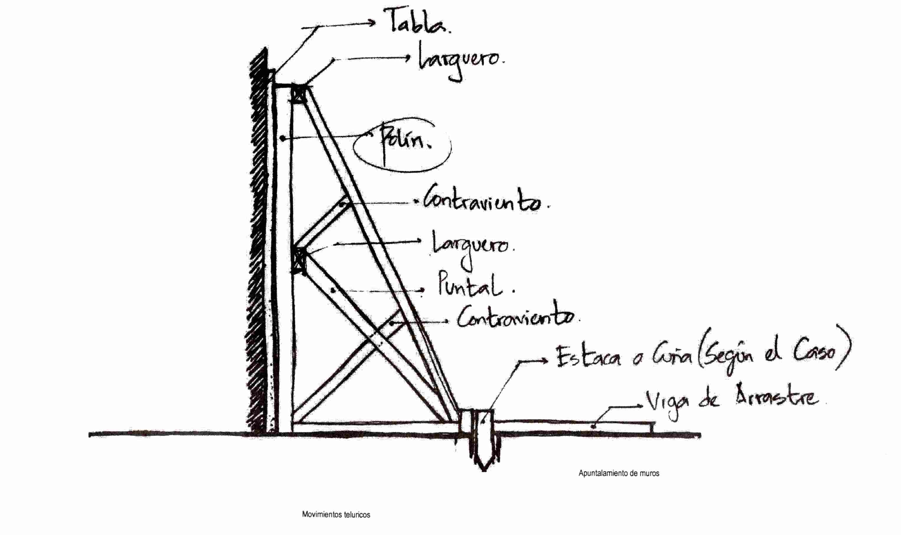 Luego de realizado todo el trabajo de los capítulos anteriores, se procede a realizar la etapa de apuntalamientos necesarios en el inmueble a intervenir.Se debe tener presente que los apuntalamientos son estructuras que en teoría son de carácter temporal, sin embargo la realidad económica nacional está en una etapa de transición, por lo cual se debe pensar los apuntalamientos de modo tal que aunque son estructuras temporales, se puedan localizar en puntos que afecten lo menos posible el funcionamiento del inmueble si es el caso, puesto que algunos inmuebles seguirán ocupados luego de su apuntalamiento, cuando su deterioro no es extremadamente grave.