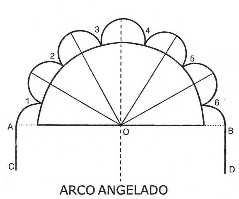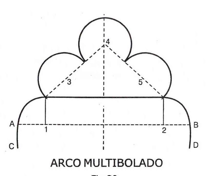 las rectas A -C y C- B. Seguidamente, haciendo centro en O y con un radio igual a la semiluz, o sea O-A, trazamos la circunferencia A- D -B. Luego, haciendo centro en C, trazamos con radio C-D otra circunferencia que cortará a las rectas A - C Y C - B en los puntos E y F. Las mediatrices a las rectas A - E Y F-B cortarán la línea de arranques A-B en los puntos 2 y 3 Y al eje O -D en el punto 1, que son los centros de los arcos de circunferencia A - G, B - H Y G - C - H, tangentes entre sí que forman el arco carpanel de tres centros.