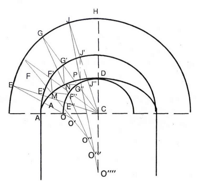 Desde las divisiones se trazan los radios E-C; F-C; G-C; J-C; etc..., y desde los cruces de estos con las otras dos semicircunferencias (E' E", F', F", etc.) se trazan paralelas a los ejes, cuya intersección L, M, N, etc..., serán puntos de elipse. Si unimos estos los puntos mediante rectas con las divisiones correspondientes en la circunferencia exterior E - L, F - M, G-N Y J-P, las prolongaciones de estas rectas se cortarán entre sí y con los ejes del arco, determinando los centros O, O', O",)'" que son los de los arcos de circunferencia que nos determinan el carpanel.