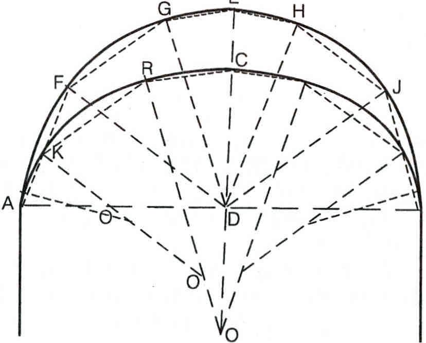 Como se comprenderá, de la elección del primer centro O dependerá la mayor o menor perfección del carpanel que se trace. Para evitar tanteos recomendamos trazar primero el arco a ojo y, una vez hallada la curva que más se aproxime al arco imaginario, determinaremos el punto K en el cruce de la curva aproximada con la cuerda A F Y trazando desde K la paralela al radio F D, hallaremos el centro O, punto de partida del trazado descrito anteriormente.