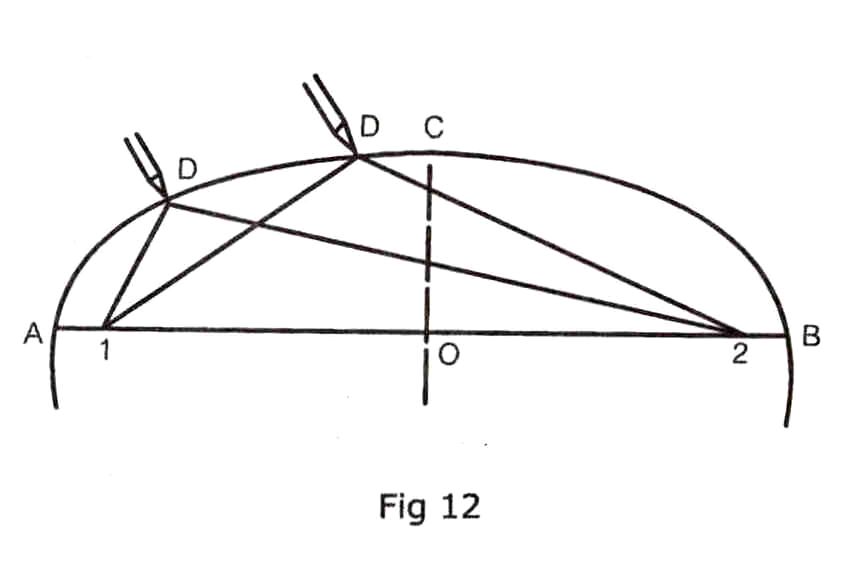 Sobre los dos ejes (eje mayor = línea de arranques, eje menor = flecha) se describen las semicircunferencias que tiene respectivamente por radios C- A y C-D. Haciendo igualmente centro en C se describe otra semicircunferencia con radio igual a CA + CD. Esta semicircunferencia mayor se divide en 10 partes guales (una más que el centro de números que se desean obtener).