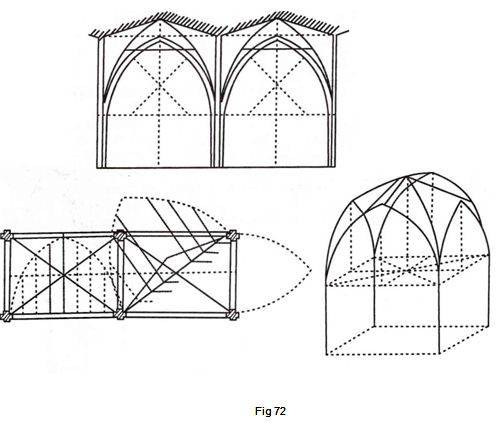 Cuando la bóveda estrellada se desarrolla sobre varios tramos, se prescinde de los arcos torales (fig.81). Puede disponerse de manera que todos los nervios, fundamentales y secundarlos, estén situados sobre una misma superficie esférica, aproximándose entonces a una bóveda vaída.