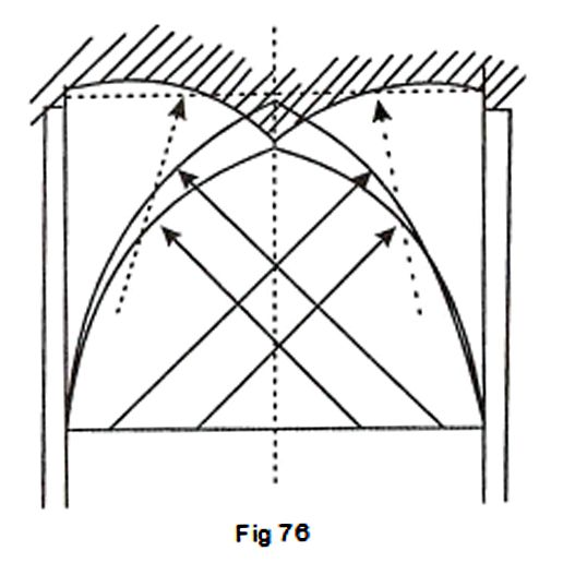 La clave de los arcos diagonales puede estar a mayor altura que las de los arcos frontales, obteniéndose la bóveda por arista de cañones curvos ascendentes (fig. 74) o, si las líneas de clave de los témpanos opuestos forman una curva continua, la bóveda, por arista de cañones curvos en un solo arco (fig.75).