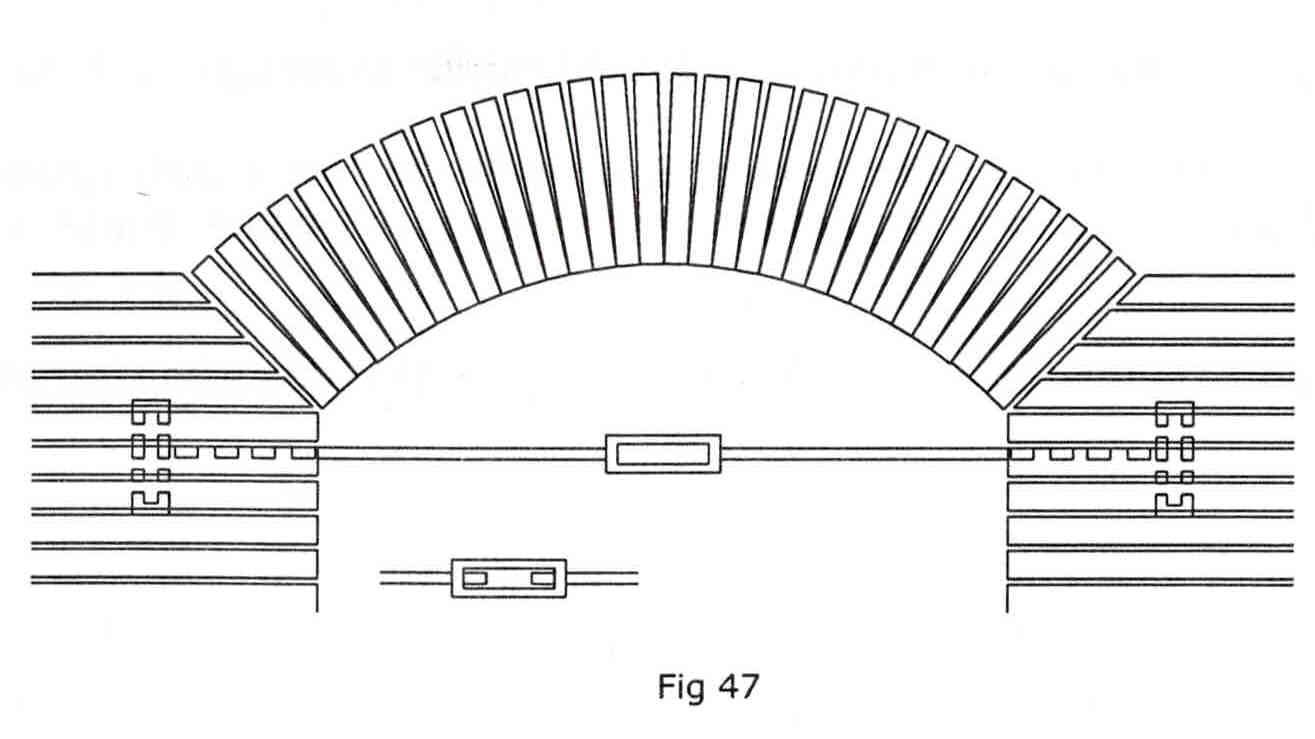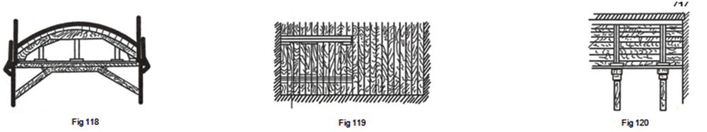 La forma de disposición de las cimbras varían como antes hemos dicho, según sea el género de la bóveda para la que hayan de servir. Las figuras 118, 119 Y 120 muestran en frente, planta y sección, la disposición paralela de las cimbras para una bóveda de cañón seguido. Si el cañón es en bajada o en rampa, las cimbras se dispondrán también paralelas, siguiendo la rasante de la bóveda.