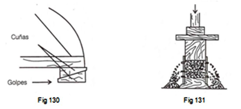 Descimbrado con cuñas de madera: Los cuchillos se hacen apoyar sobre las cuñas, las cuales llegado el momento del descimbrado se hacen resbalar aplicando pequeños golpes en la cabeza menor de la cuña inferior (Fig. 130).