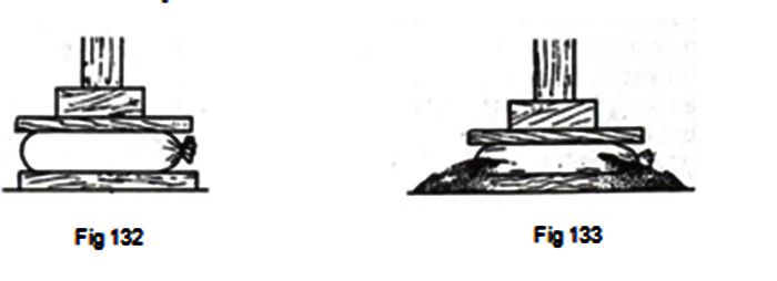 La figura 110 representa una cimbra sencilla que puede emplearse en la construcción de un arco rebajado de fábrica de ladrillo. Consiste en una tabla apoyada en un punto medio por otra puesta a 450, apoyada a su vez por otra puesta en tornapunta. Ambas se apoyan fuertemente en los muros.
