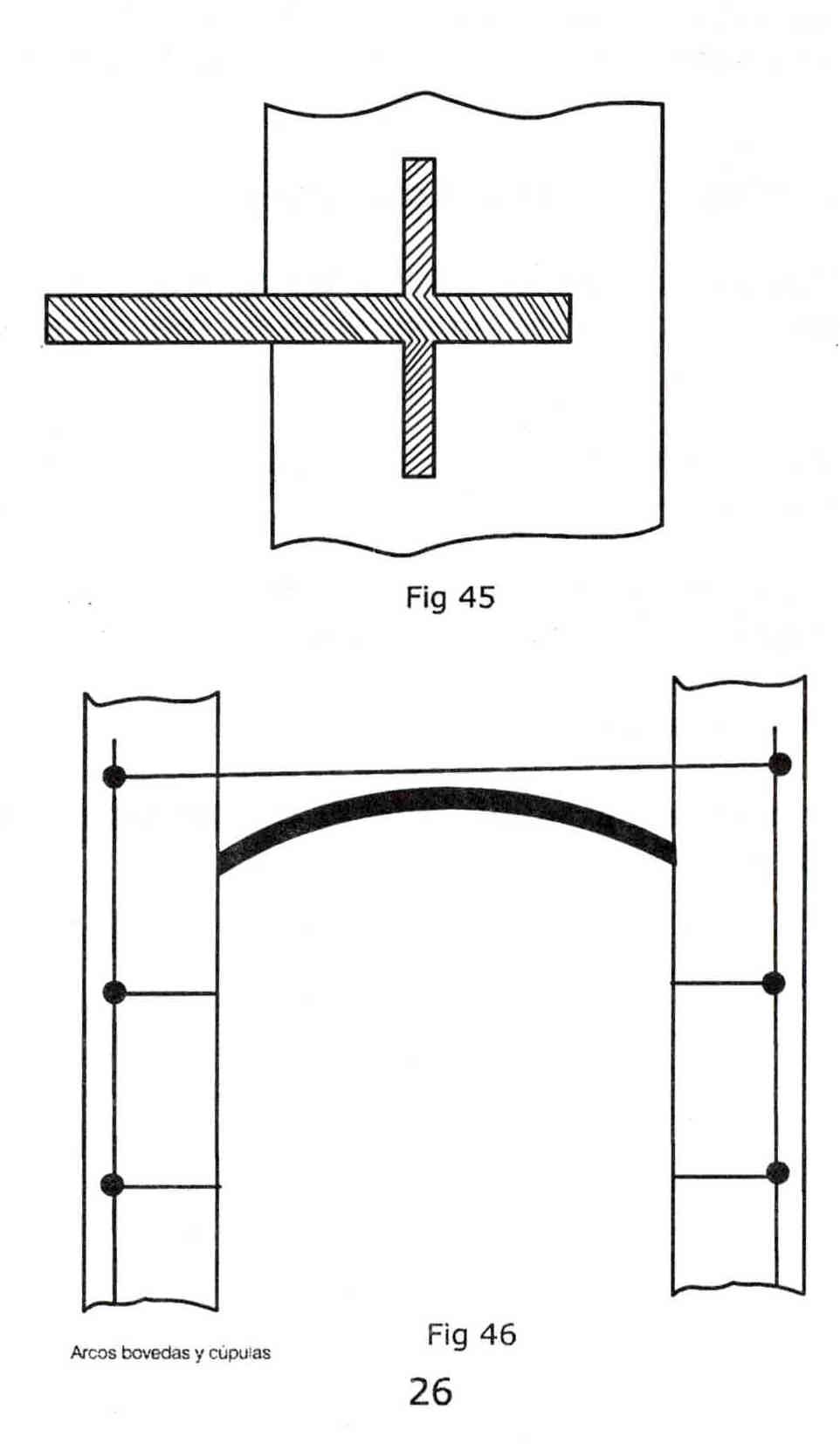 Estas cimbras se apoyan por sus extremos, bien en pies derechos adosados al muro, bien sobre unas ménsulas o cornisas de ladrillo (fig. 105). Para preparar los cerchones se dibuja el arco en el suelo y sobre él se recortan y se clavan las tablas debidamente.