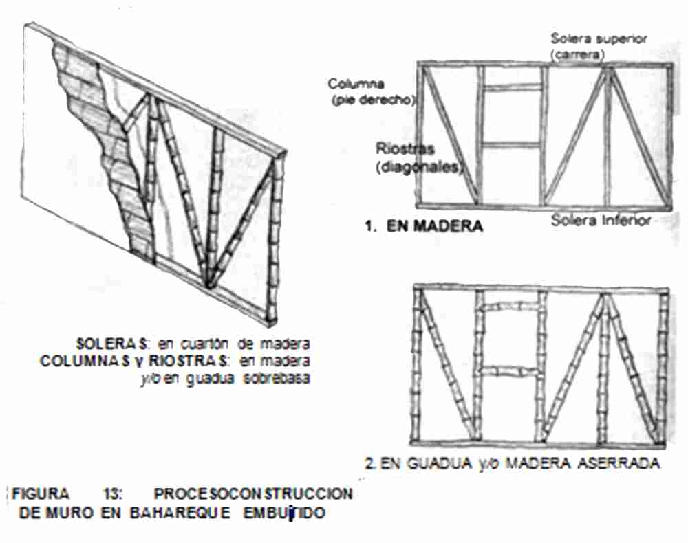 El entramado o estructura de la pared de bahareque esta conformado por una serie de elementos verticales llamados para les, pie de amigo o pie derecho, que van fijos a otros horizontales llamados soleras y con otros elementos inclinados entre los para les llamados riostras, formando un marco estructural que soporta aceptablemente las exigencias estructurales.