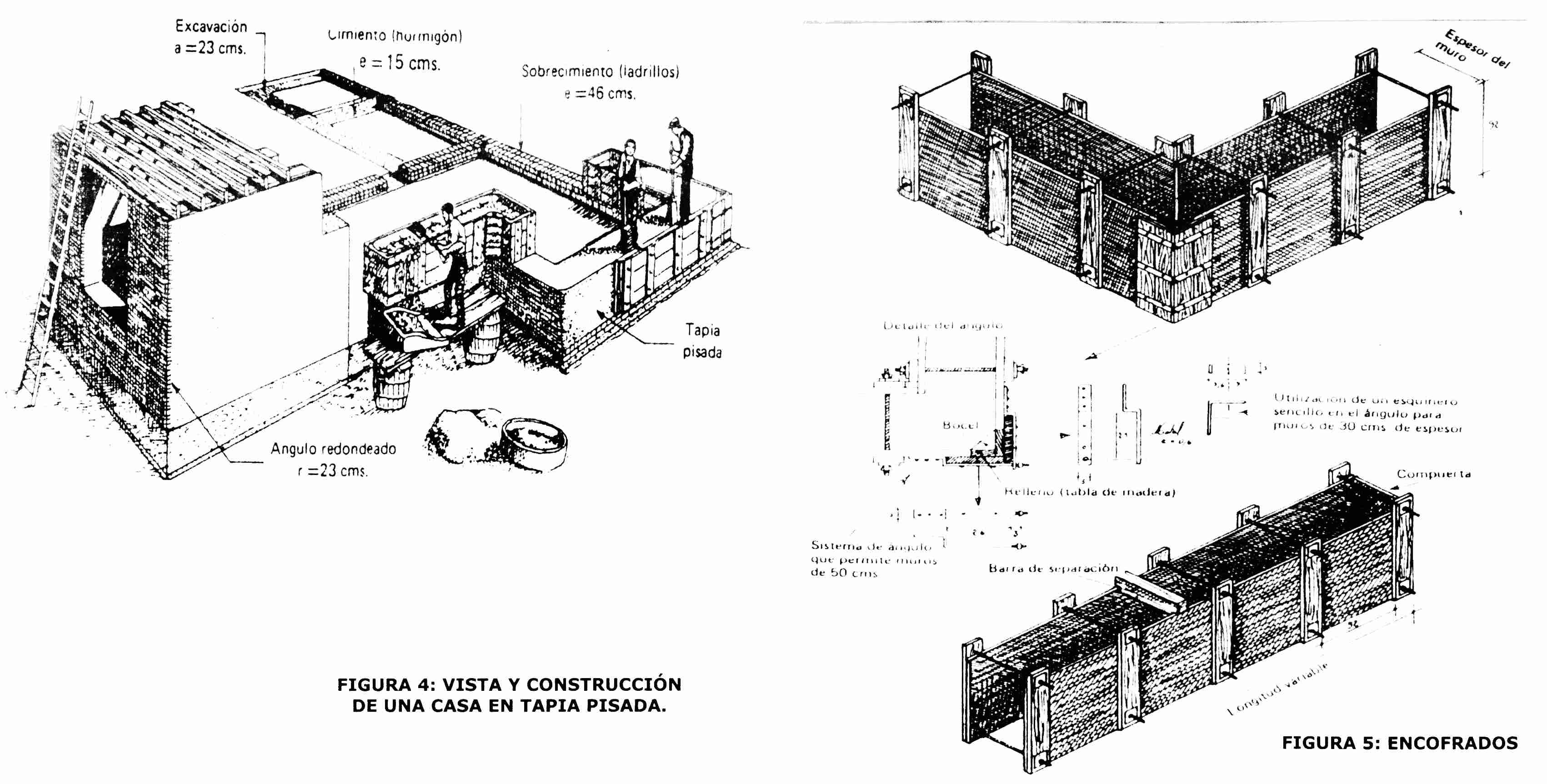 Cimientos: Entre la cimentación y el muro de elevación en tapia, debe existir aislamiento hidrófugo; es adecuado usar adobes asfálticos o camada aislante colocada sobre una capa de 15 cm. de solado. El corte de la humedad capilar del suelo será el encargado de dar mayor durabilidad a la obra.El sistema de muros en tapia pisada, presenta ventajas e inconveniente así: