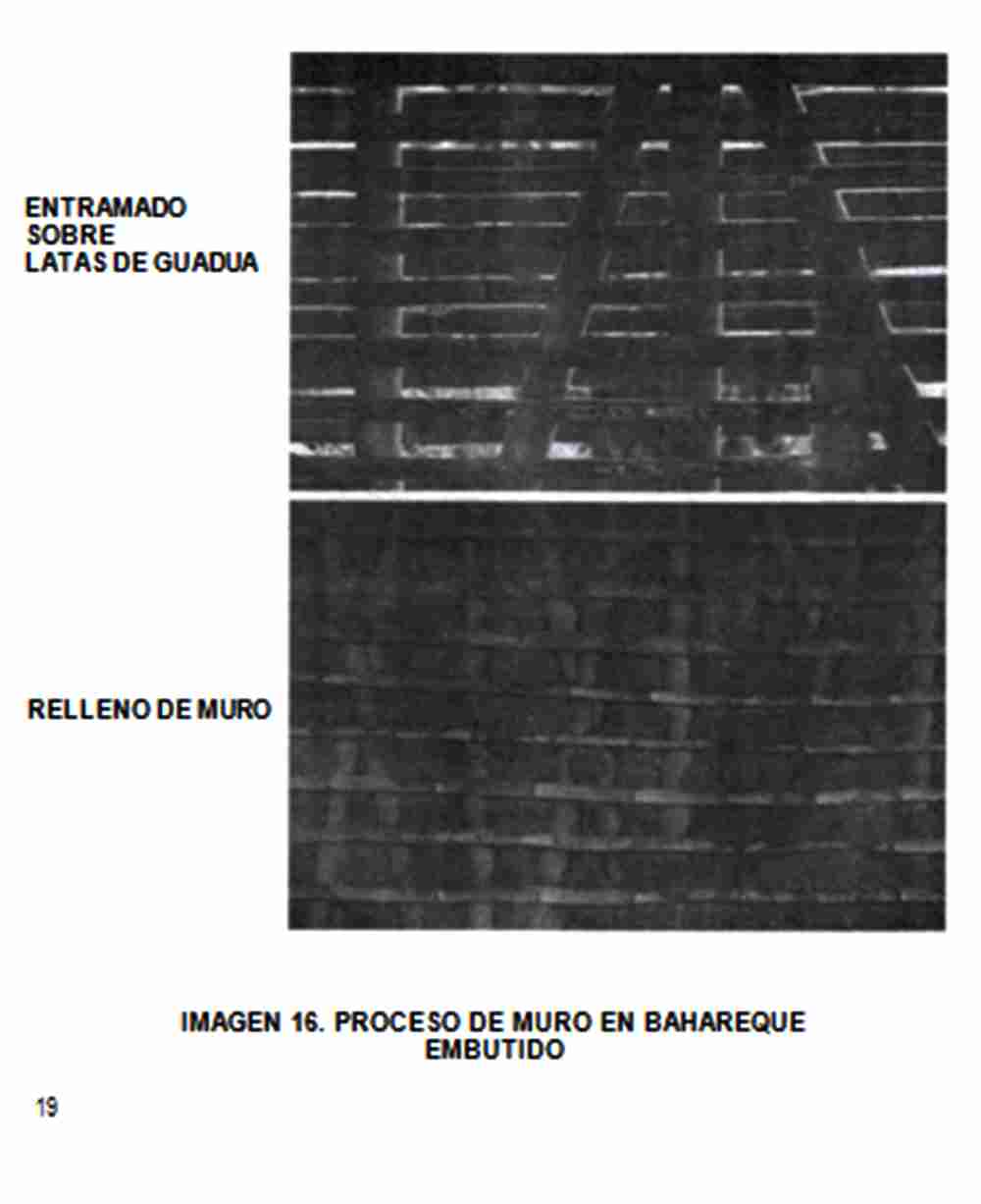 El entramado o estructura de la pared de bahareque embutido esta recubierto con latas de guadua de 4 cm. promedio de ancho, clavadas horizontalmente con el lado externo hacia adentro y con una separación promedio de 8 cm. para facilitar el relleno de su interior con arcilla húmeda o barro, en algunos casos previamente mezclada con paja. A medida que se va rellenando la pared en su interior se va presionando la arcilla con los dedos hasta que esta quede a ras de la parte externa de las latas de guadua.