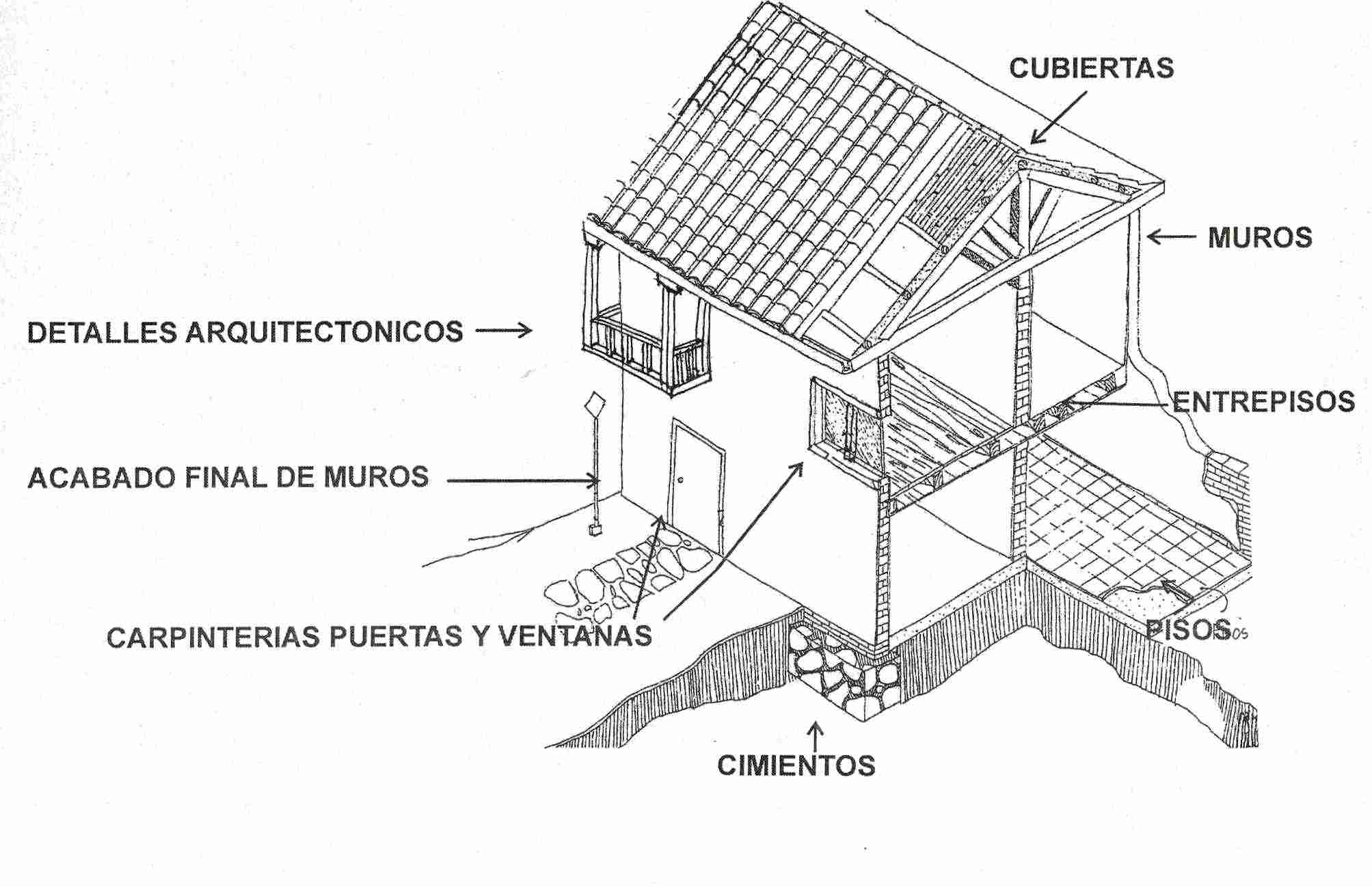 Muros, acabados de muros, pisos, entrepisos, cubiertas, carpinterías y detalles arquitectónicos.