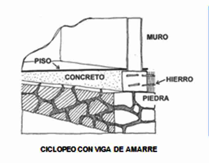 Concreto Ciclópeo: Compuesto por arena, cemento, agua, piedra tamaño medio.