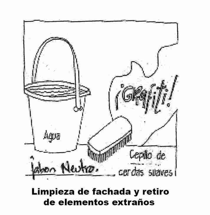 el solvente adecuado para ejecutar la limpieza. En su defecto, cuando se trate de una limpieza común sin grandes especificaciones técnicas ni químicas, se lava la superficie con agua y jabón neutro, usando cepillo de cerda suave. Nunca se hará limpieza a base de chorro de arena o raspando.