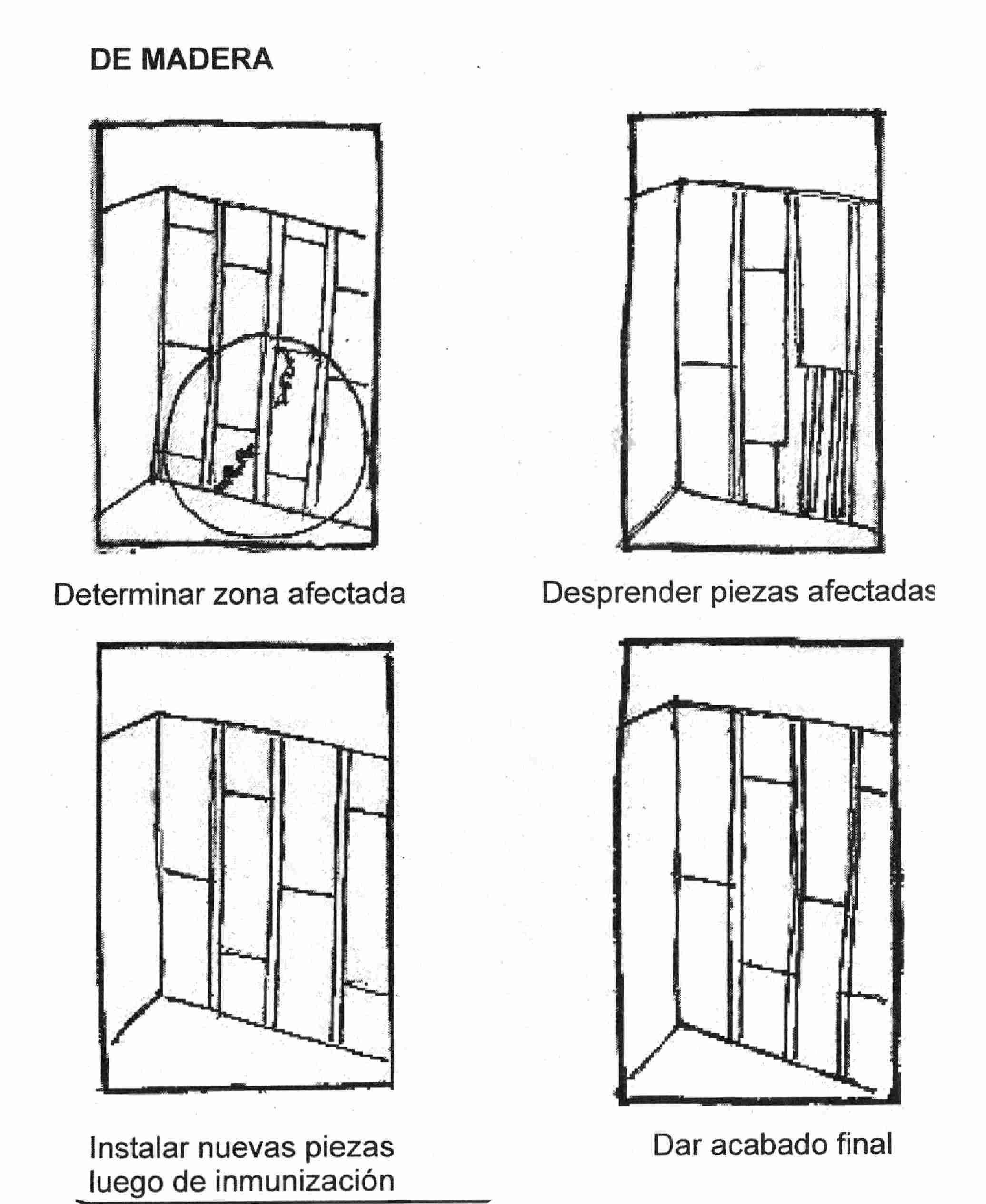 Se impregna la madera, usando para ello una brocha de pelo, la mezcla de un producto a base de: pentaclorofenol, Nuvan 60, Thiner, y Alcanfor; este trabajo se debe hacer con guantes de hule, mascarilla y gafas.