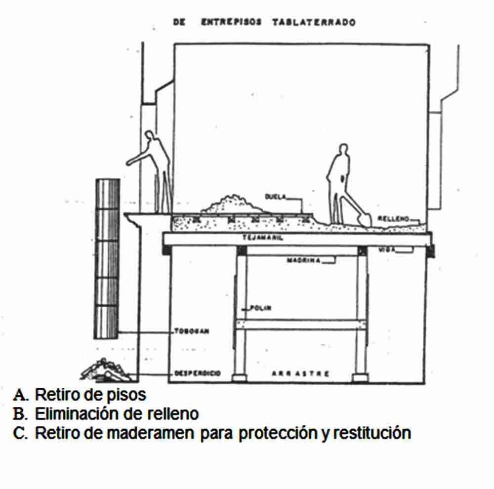 Pisos en madera: Como primera medida debe anotarse que siempre se debe tener presente las obras de limpieza, protección, desinfección, consolidación y preservación de maderas que se enuncian al principio de la cartilla.