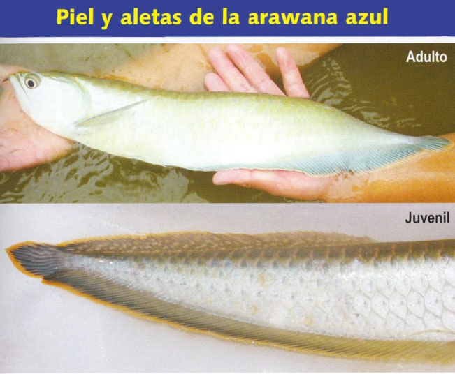 La arawana azul posee aletas con radios blandos, lo cual supone una ventaja para su manejo en cautiverio. La tonalidad del color de las aletas y del cuerpo de la arawana azul cambia de acuerdo al estado nutricional, a la calidad de agua y a su estado de desarrollo. Durante las etapas iniciales de crecimiento presenta tonalidades más oscuras en el cuerpo y aletas.